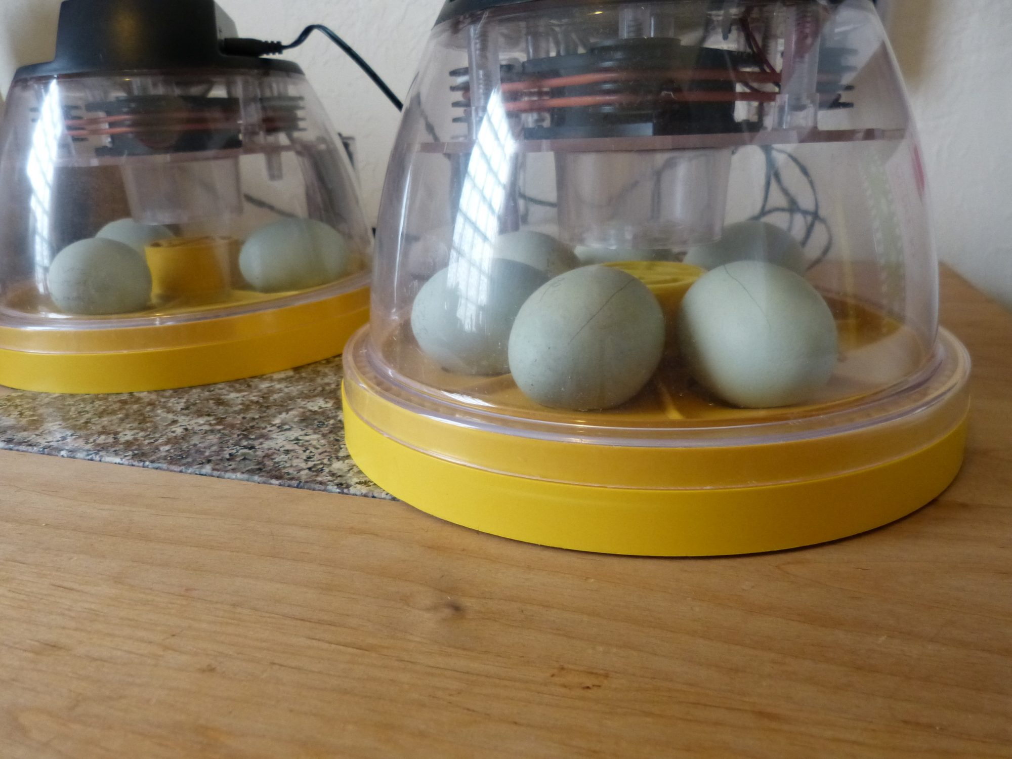 Welcome to Incubator land! - farthest one - the Easter Hatch-a-long finishing up, middle one, 2-dozen in an Octagon 20 that was gifted to me. (Thank you Vanessa) - and nearest one is two-days into the incubation of 14, and on the other side of the room, 5 in a Brinsea mini advance. Some people just don't know when to quit. However, if at this stage of my project, only 1 in 8 will match my needs -- I need to hatch 80 chicks to get 10 to go forward, right?