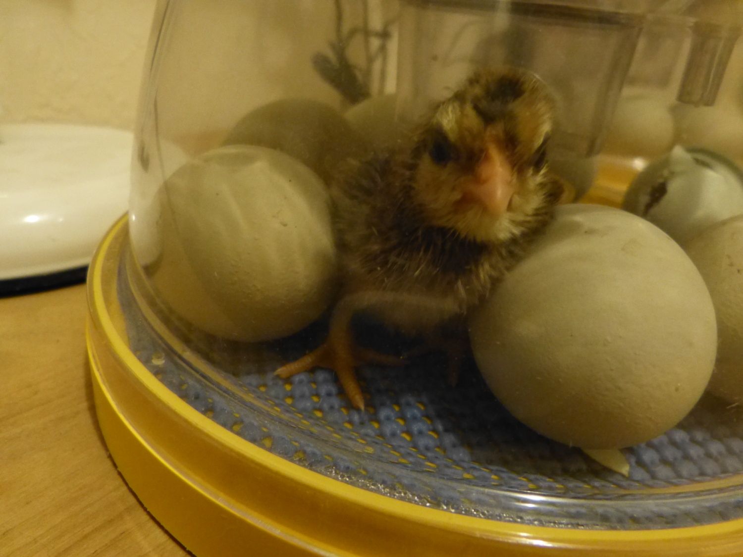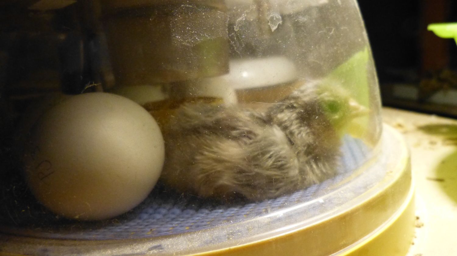2017-0-5-04 - Perfect Chick - Today is hatch day. Last hatch day of the Spring breeding season -- Last night, not even a pip -- today I wake up and find a lavender-brown (Isabel) in the Brinsea mini. This baby worked the night shift. There are 7 other eggs. One of which was dropped during candling and taped with scotch tape, two or three of which had zero air cell. All the more reasons this baby is a welcome sight.