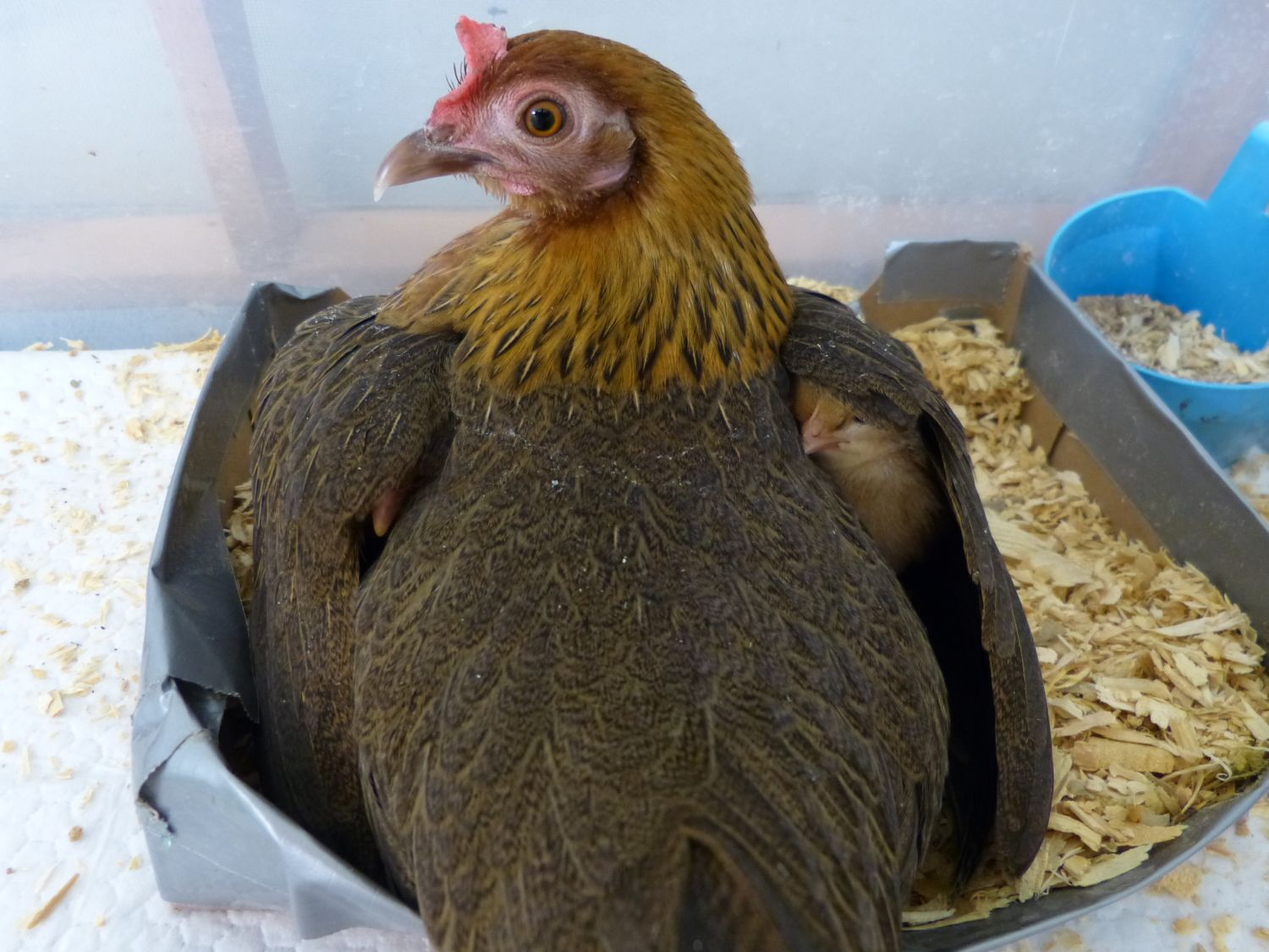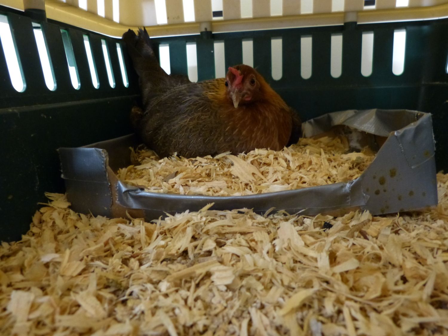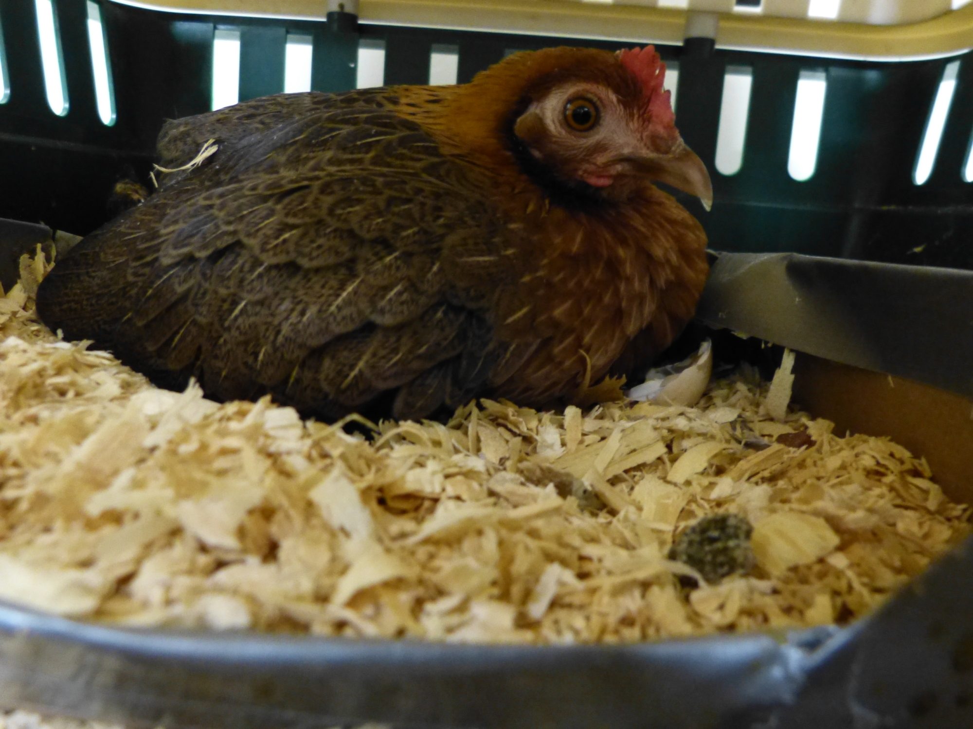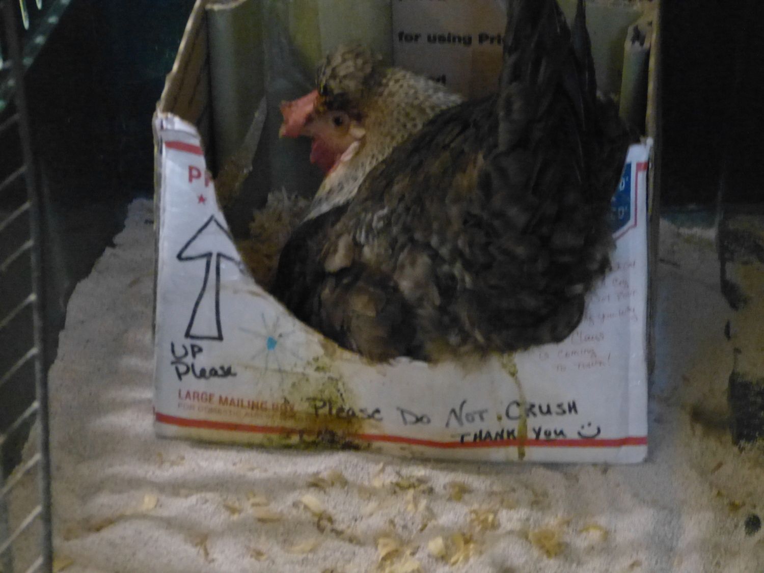 She's now demoted to a pet carrier -- and she has laid an egg in it. Perhaps she will go broody again. (HA - just checked and she is sitting on the egg she put in the pet carrier..).