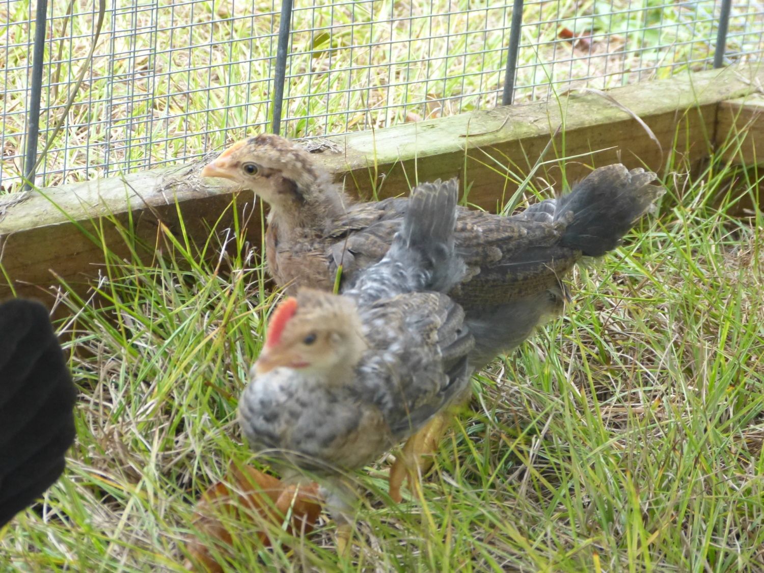 POL Legbar pullet, her sister partially visible on the right, and in the back, her brother.
