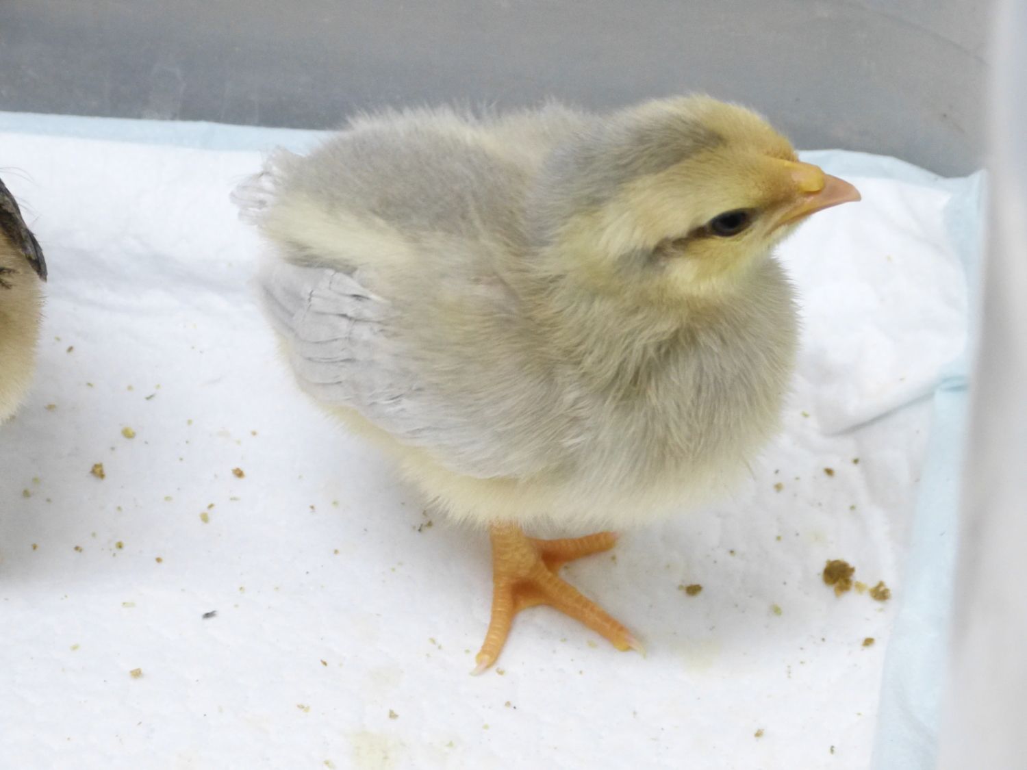 Brooder 3 with chicks from "Jack". What I would like to have is a replica of Jack for type -- but of course lavender genetics... Maybe "Sliver Jackson'' will be the one -- the ohly way to tell him from the other two Lavender-patterned Isabel duckwings in there (and I hope he grows to be barred) is that he is a day ahead or two days ahead of them and getting wing feathers -- but the others will catch up fast, so he needs to be marked (banded) today.