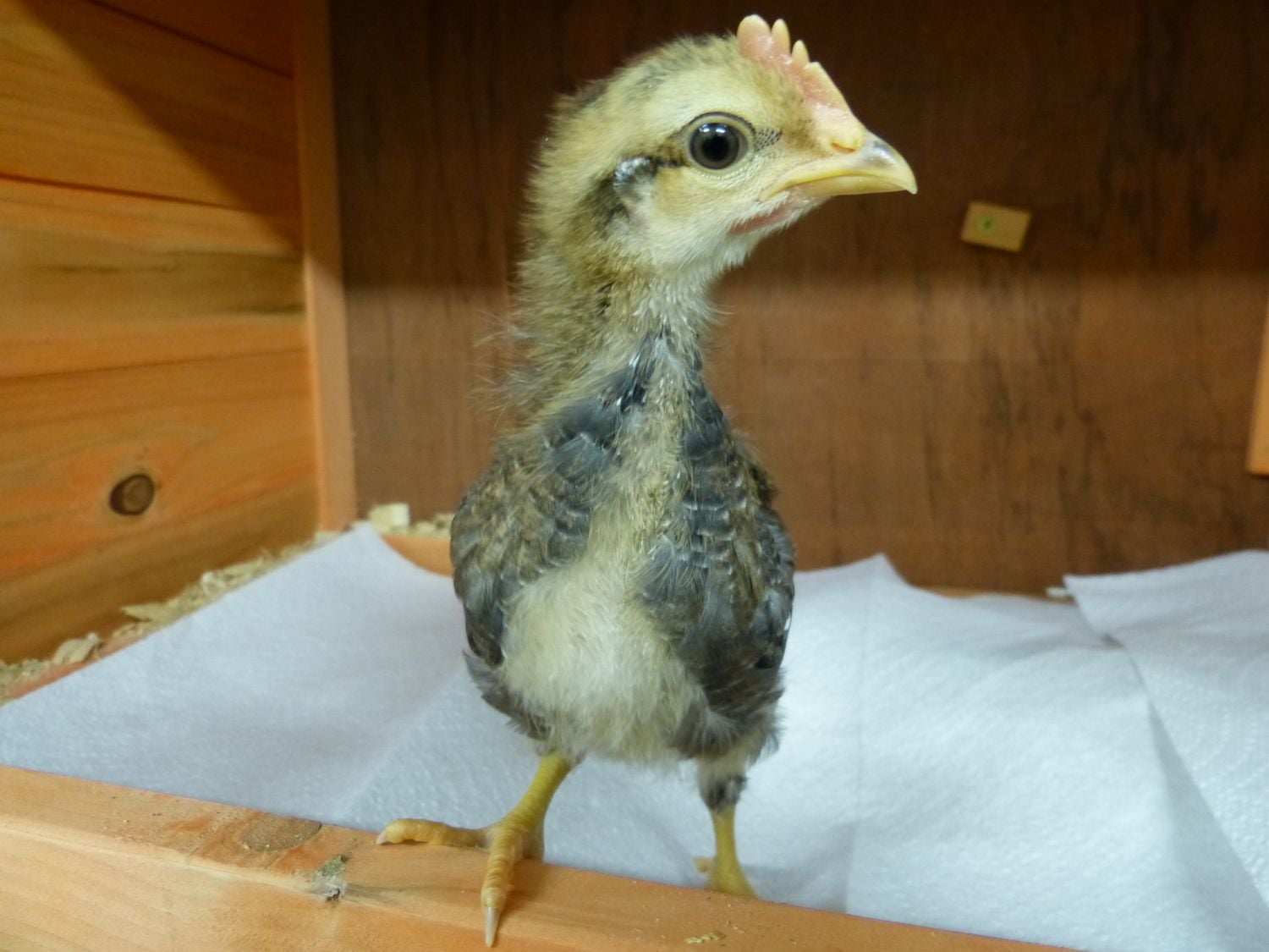 2015-03-28 - Left Behind - One of the great things about Cream Legbars is that when the person who came to pick up the pullet chicks took them home, there will be no surprise roosters in their flock. The chicks were beautiful babies - I hope that they grow to be productive hens for their new owners and all will live long and prosper. Meanwhile, the two boys from that hatch spent the week 'home alone' since I was out of town. They got a daily visit from the chicken sitter -- but basically they were just on their own in the brooder. Here's how cute they are now as one-week olds: