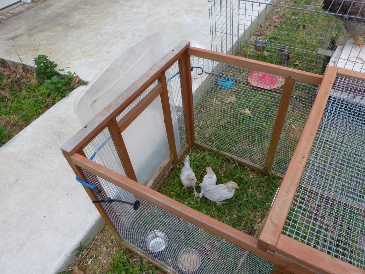 The chicks hatched on Jan 31. - Ready for the outdoor pen which I just moved to fresh grass, and put the cleaned out rabbit hutch inside. Last night was down to 38-degrees, so from here on the temperatures should moderate.