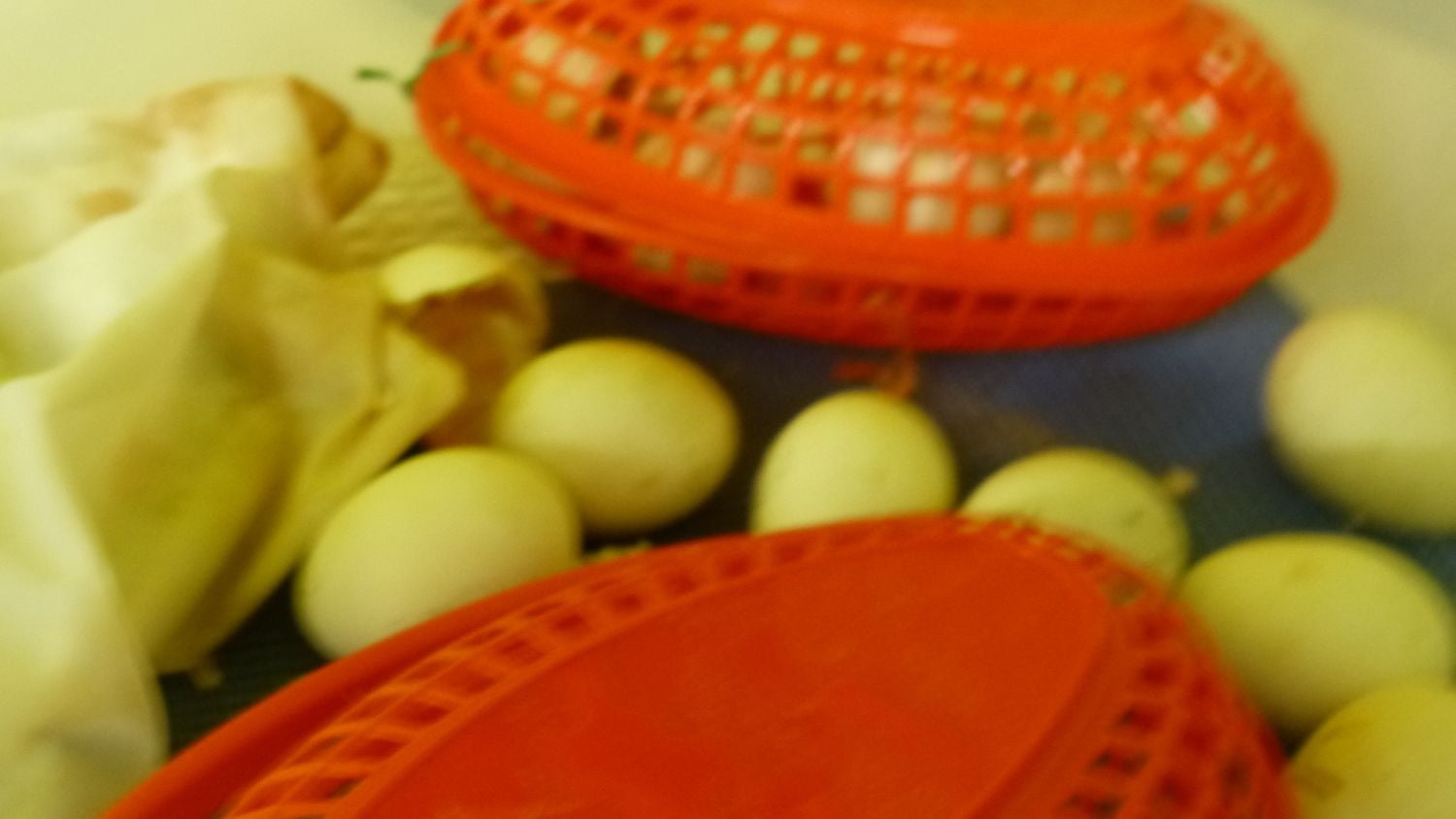 The remainder of the eggs. Two 'pedigree baskets' - aka food serving baskets - idea complements of Campingshaws - and a nylon garment bag -- and loose eggs to keep track of who's the father...