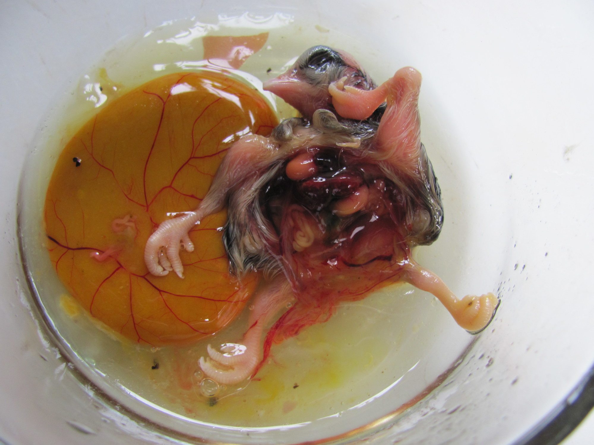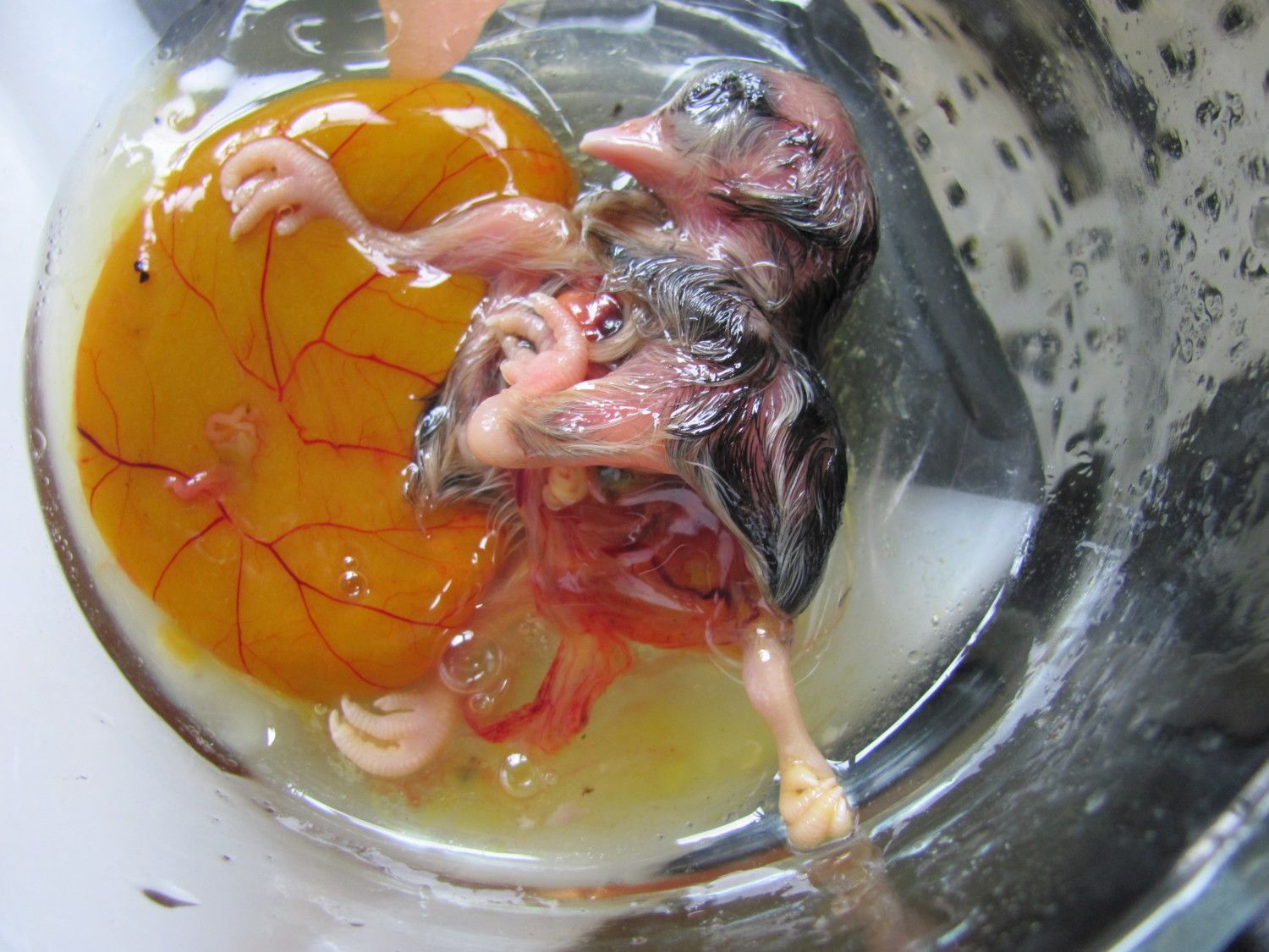 I have been incubating eggs for years and have never found anything like this before and am wondering if anyone else has? The chick was supposed to hatch yesterday. It was a brown egg--either from a Black Sex link, Comet, or Barred Rock hen and the rooster (only one I have) was an Ameracauna. Since all other eggs hatched a day earlier than they were supposed to I decided that this one was probably dead and I was going to open it up to see what had happened to it. I was incubating 42 eggs and had 35 healthy chicks hatch.