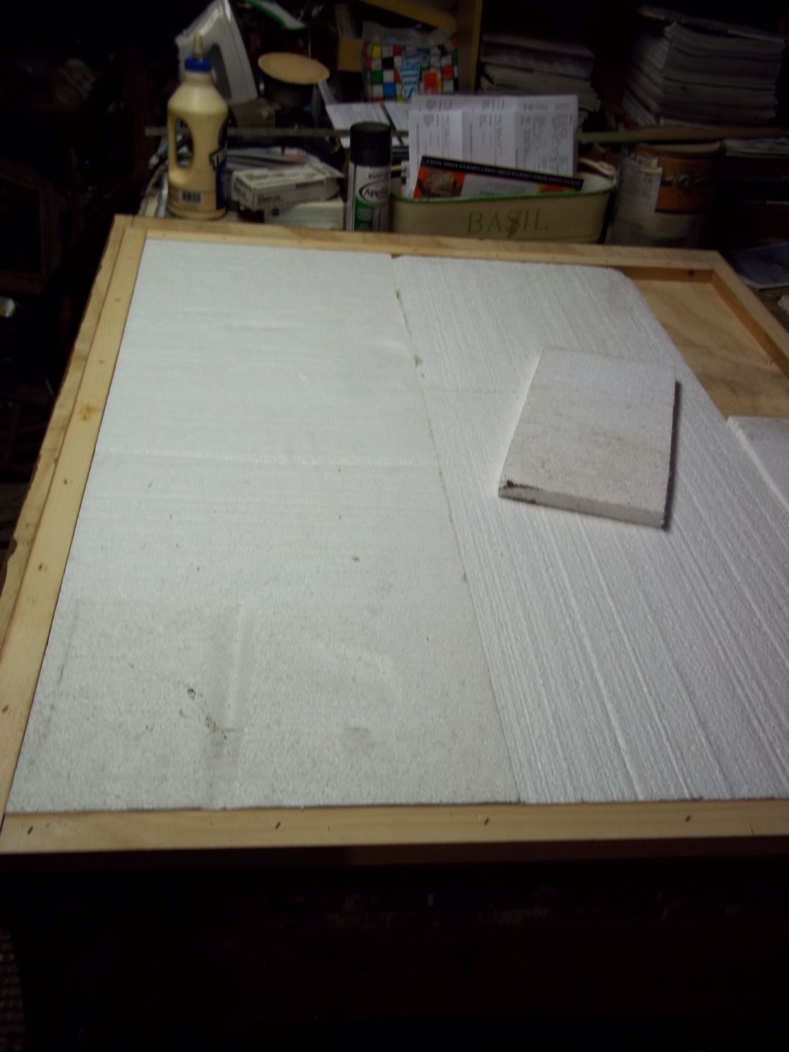 Below, the base, wheels, sides and roof are assembled. This picture shows the roof insulation before the top plywood layer and roofing material were installed and the roof venting.
