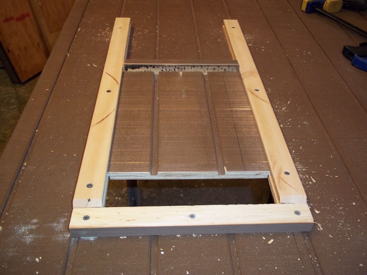 Erich made two wood frames a little larger than the chicken door opening and placed one frame on each side of the chicken wire and screwed them together. Then he cut an X in the chicken wire and bent it back around the frame to make an opening to meet up with the chicken door. The coop was rolled outside and butted up against the run.