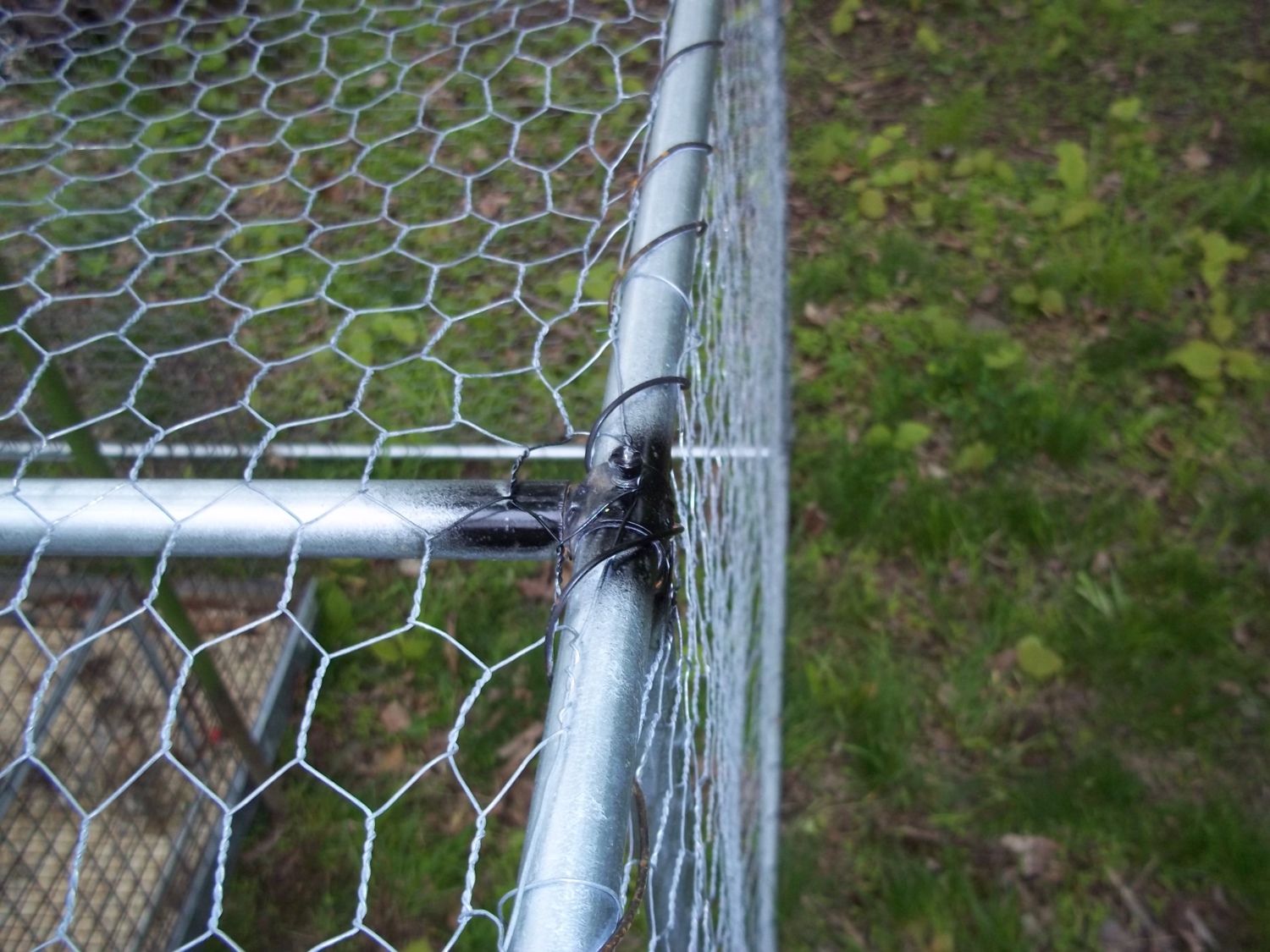 The run was built first. It is 4 feet wide by 8 feet long by 3 feet high. It is constructed of electrical conduit (light weight, strong, won't rust), galvanized chicken wire, welded fabricated "joints" and is "sewn" together with wire - through the chicken wire and around the electrical conduit.