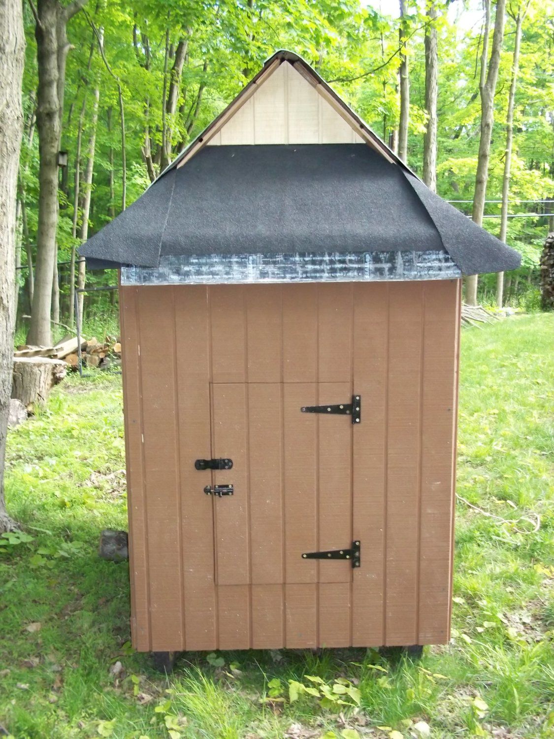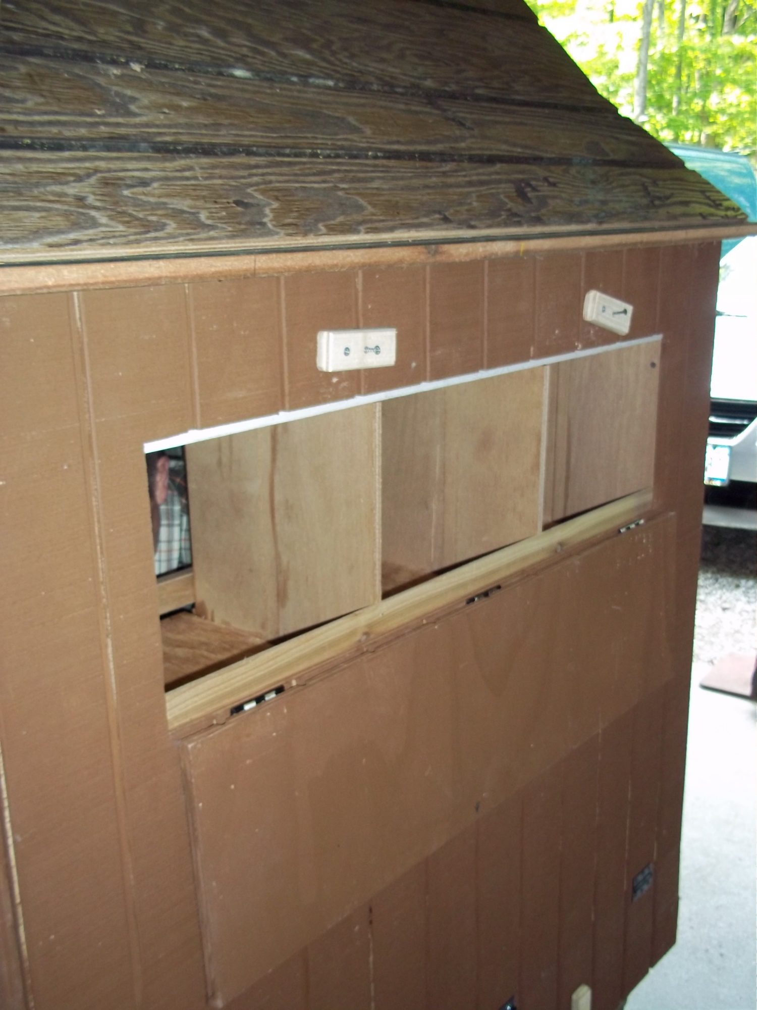 Plywood sheathing for the roof and the egg boxes were installed next. The flap covering the egg boxes will serve as a shelf when chains are attached on both ends. Temporarily, they will be screwed shut because the chicks are too young to lay eggs anyway. They are only 6 weeks old.