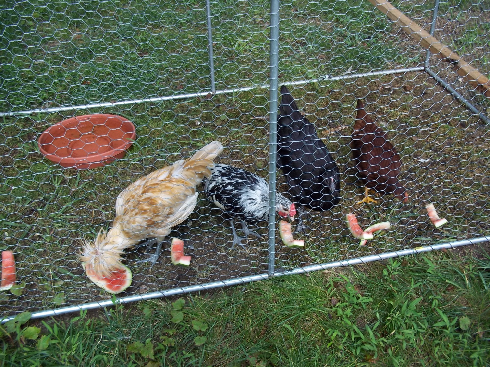 One hot day I stuck sliced watermelon rinds in the chicken wire and each chick had its own slice to peck on. They loved it.