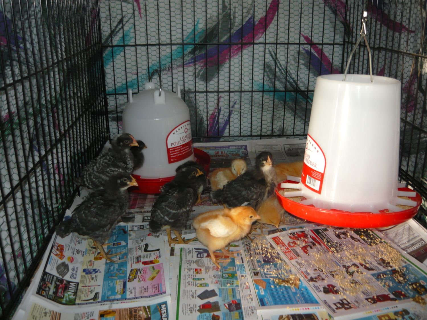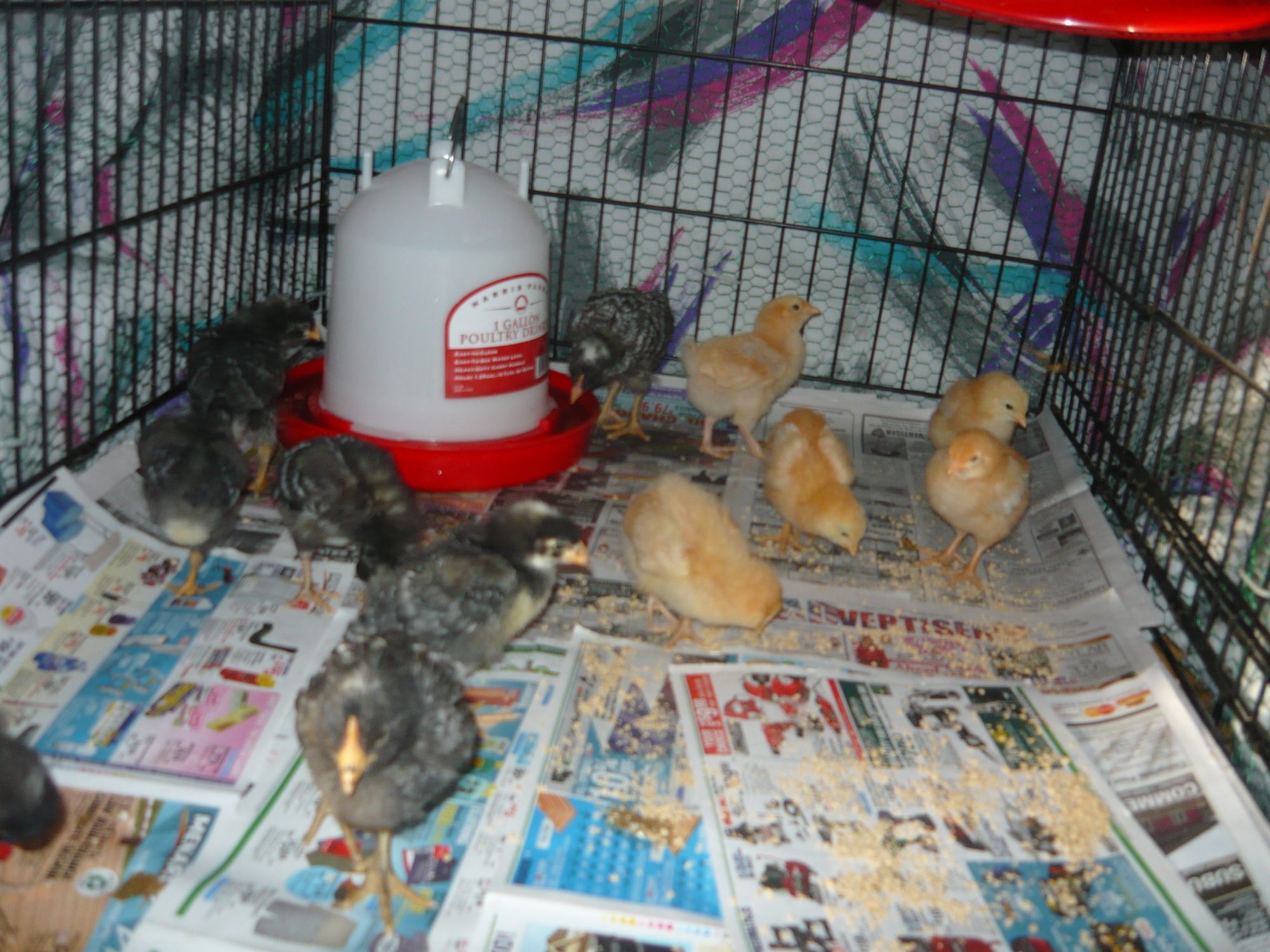 There was only one problem. We didn't have a coop! At first we kept them in the house in an old dog kennel which we lined with with news paper. We hung a heat lamp in the coop and wrapped the kennel in an old comforter.