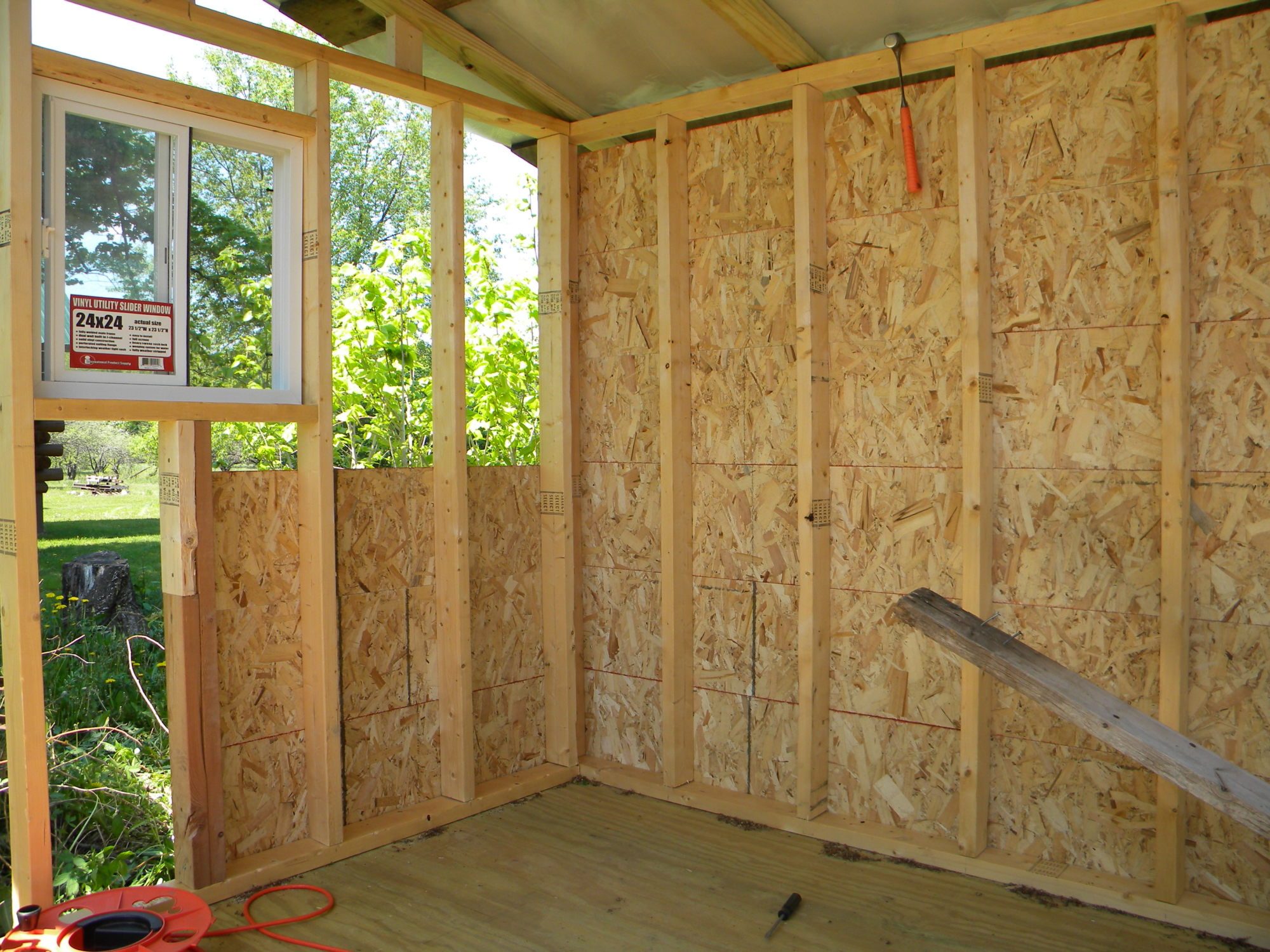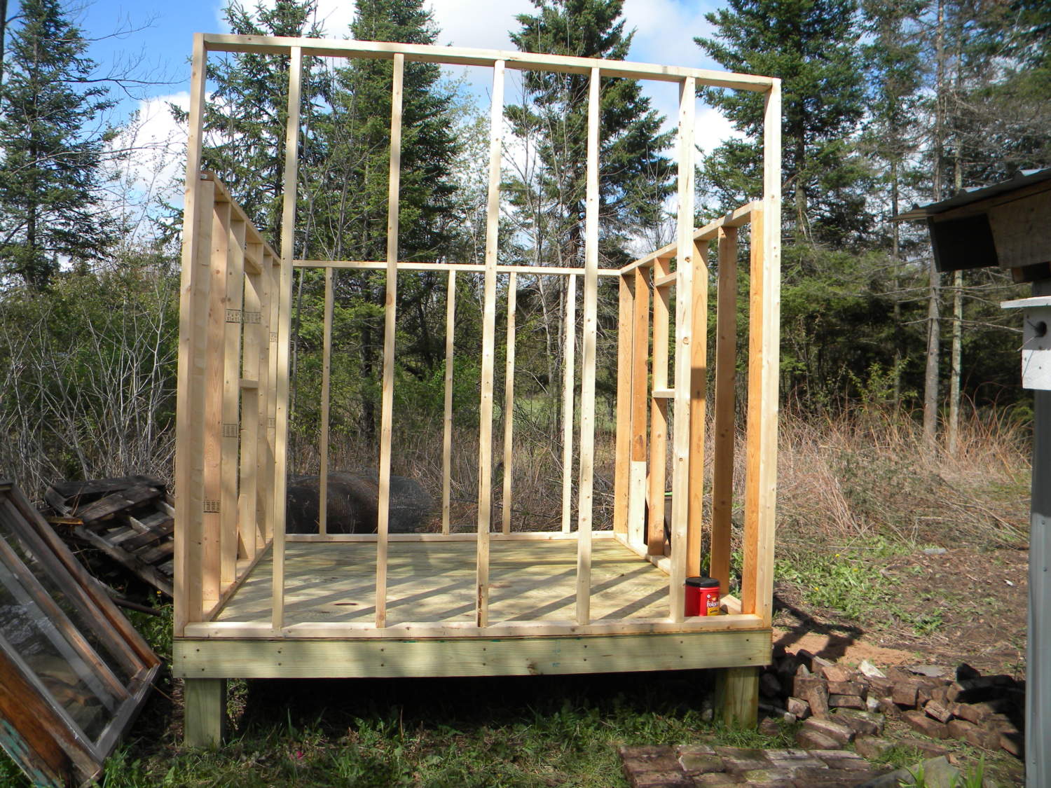 Next he put in the two windows, we decided on two small windows facing east and west, in order to get the most light and also when the weather gets poor here it usually comes out of the north. So no windows on the north side of the building. Next, we started putting up the walls which we got from the place where my mom works. She works at a place that makes hard wood flooring. Underneath some of the specialty floors, they put a type of board that reminds me of plyboard. Anyways, we used this board for the outside walls of our coop.