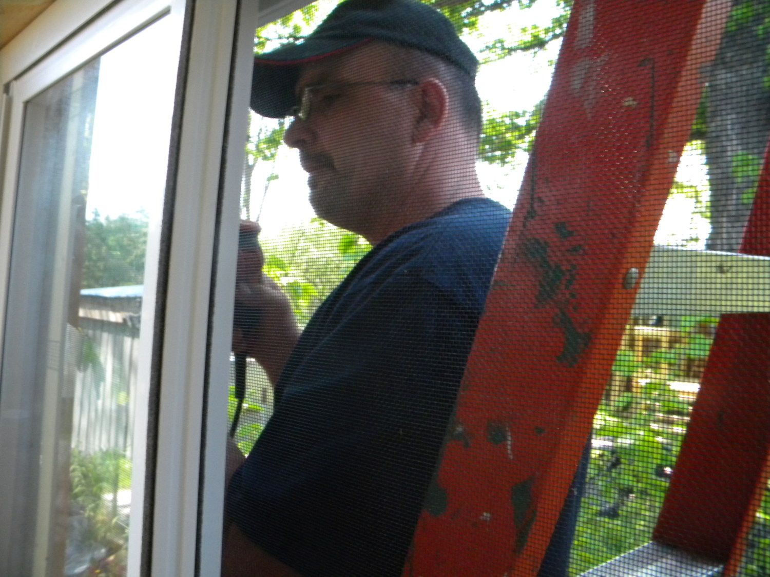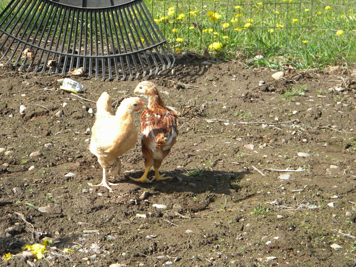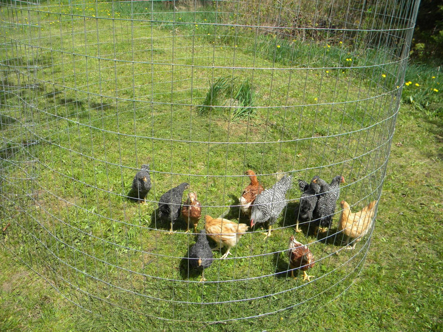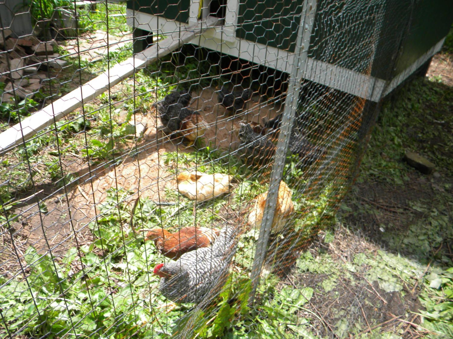 In order to fill in some of the low spots in the run we went to a creek near our house and got several loads of sand. The chickens also appreciate the sand for eating and dirt bathing. While we were building the coop we decided that the chickens could no longer stay in the house. As everyone on this site knows chickens get big quick and quite frankly, they stink. So we had to move them out into one of our garages and during the day we would set up some fencing and let them eat and fertilize the yard. They also got to explore my mom's garden.