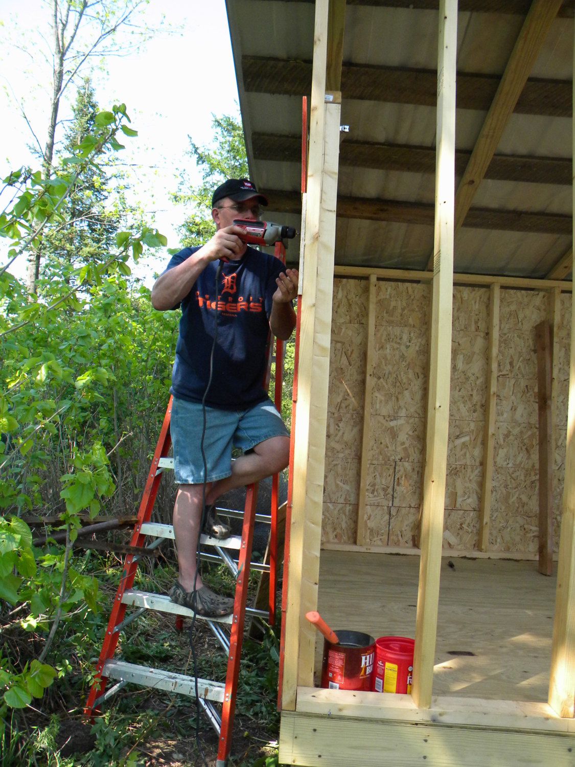 It was not crunch time. The chickens were getting A LOT bigger and needed a nice roomy place to move-about and concentrate on learning how to make tasty eggs. As I said earlier, one of my dad's conditions for us getting chickens was that he didn't have to be involved with them. But deep down my dad is a big softy, and when my mom and I started to struggle my dad jumped right in and practically build the whole coop. First he built the roof from some left over tin we had from building our garages and from re-roofing our house.