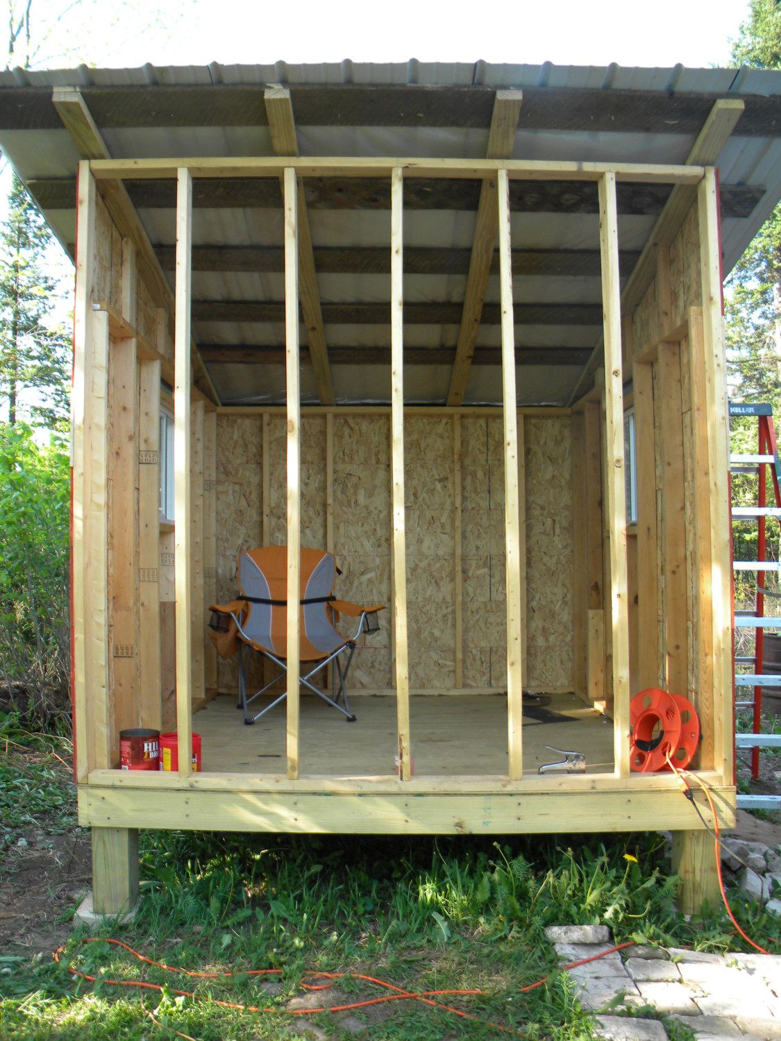 After cleaning the area up we had to decide on a coop design. So we looked around the coop designs on Backyard Chickens and eventually decided on a lean-to style coop. This coop had to be big enough for our twelve growing chickens and the chickens we would be getting in the future. The coop would be 8X8 ft, with a 12X40 ft run. The coop also had to be near one of the other buildings on our property so that we could easily run electricity to the coop.