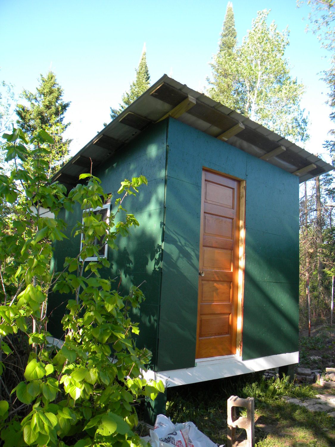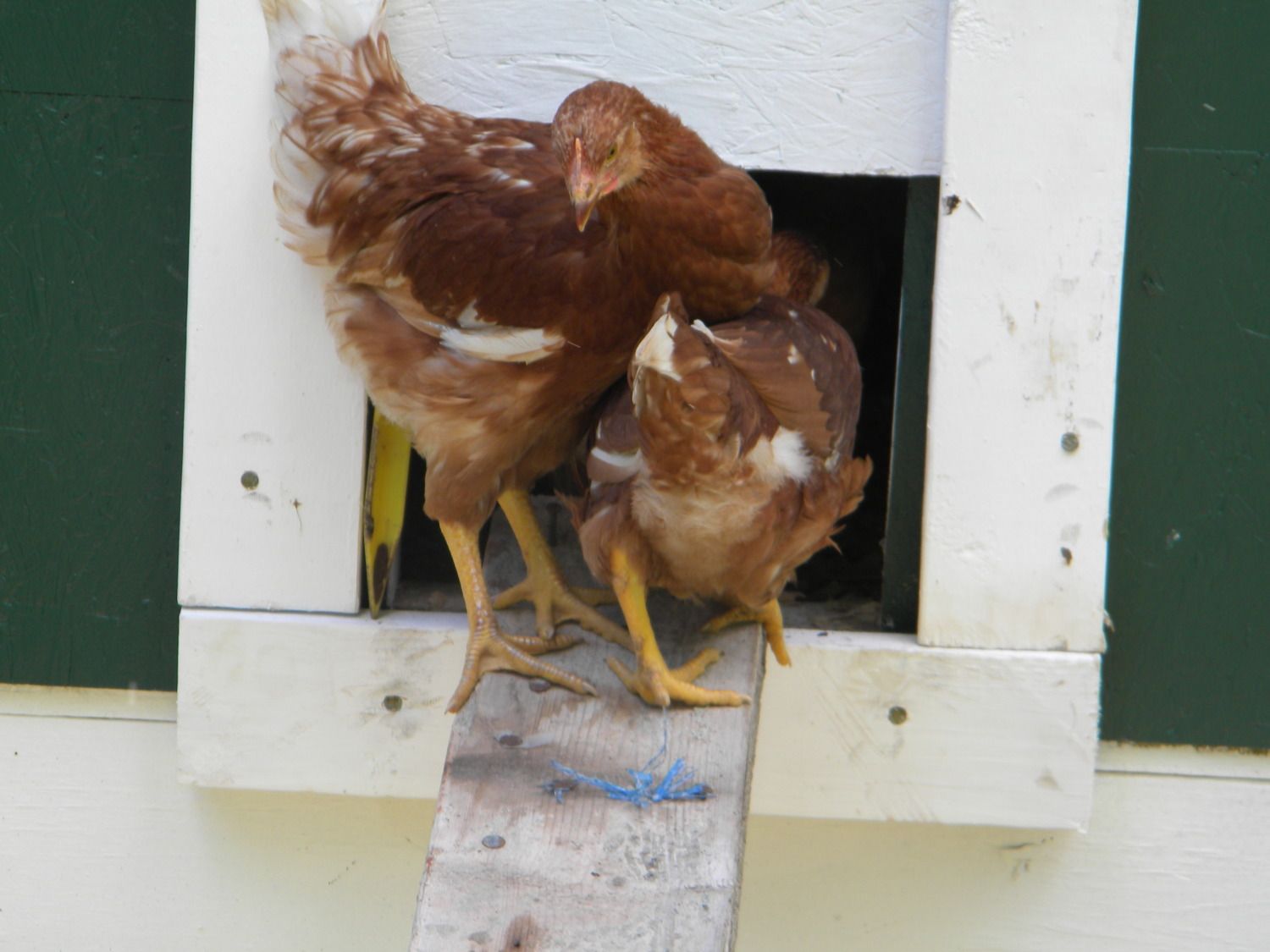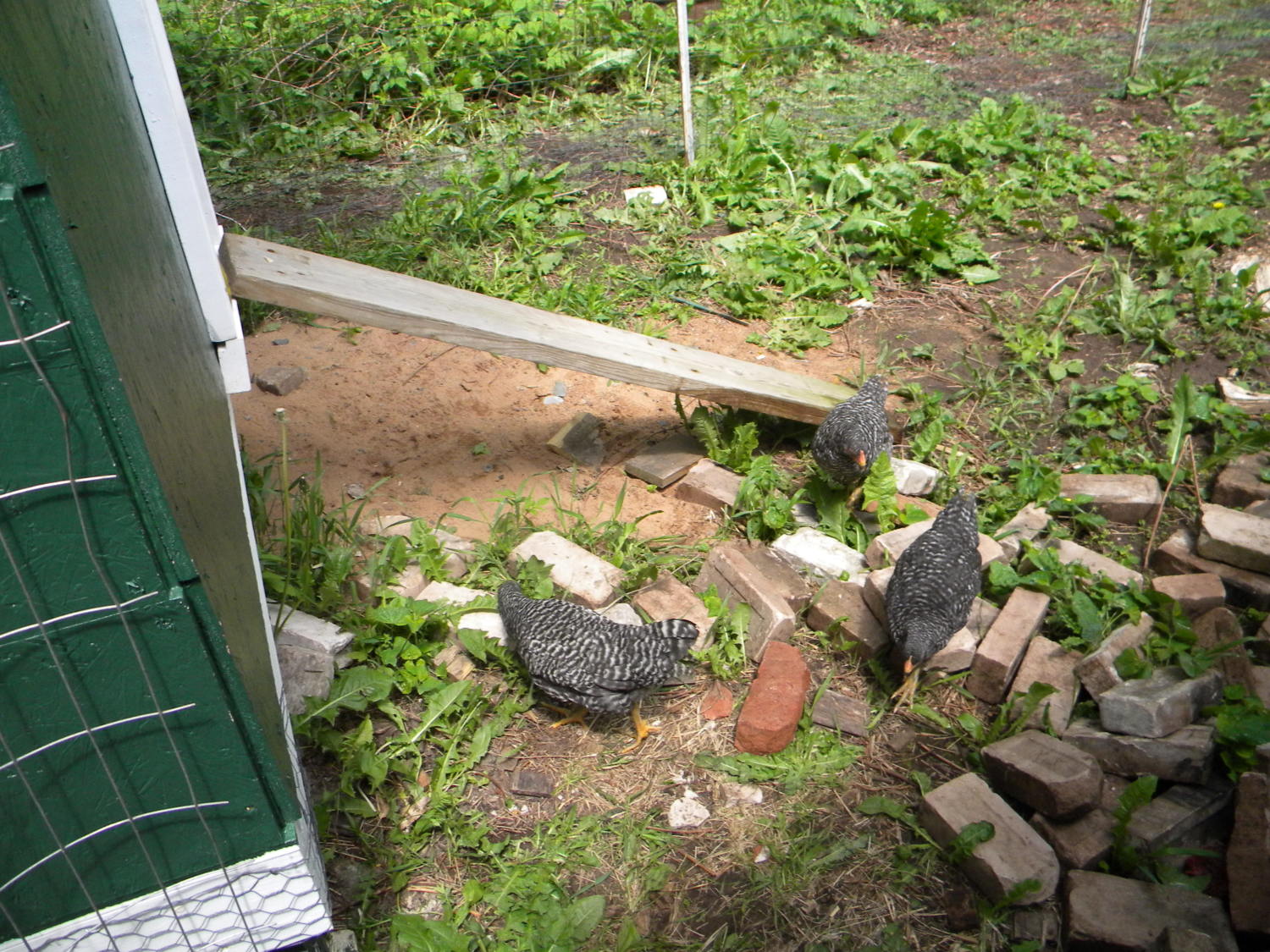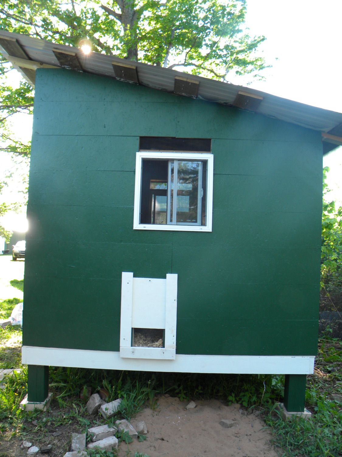 Next, we got an old door and painted the coop green with white trim. Every building on our property has a green roof, and except for our house had green walls, and green trim. My mom and I joke that having all green roofs makes it some people can not see our house from space via satellites and google-earth like programs. Take that big-brother! jk