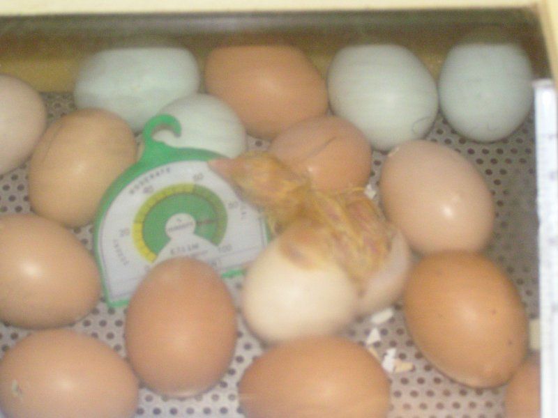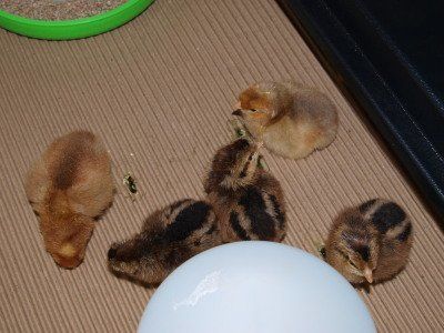 Cream Legbars are a fairly noisy breed and have voices which sound very like the Araucana which contributed it's egg colour gene. They tend to be nervous and flighty and in recent times have been bred more for their looks than their productivity, leading to medium-large eggs in the second year but only about 180 or so eggs at best. Some opinions are that they are not good winter layers though I have found that their period off lay for winter is fairly short though they tend to take quite lengthy breaks between laying clutches. They are known as non-broody, which is useful, and I have seen no problems resulting from winter temperatures in England down to -9 deg celsius or high summer temperatures in a heat-wave. Although large fowl, they are one of the more compact breeds of chicken with the females being considerably smaller than the males. The eggshells should ideally be sky blue, though some will produce olive or green eggs perhaps as a result of outcrossing. The blue eggshells differ from Araucana shells in that Araucanas should be blue all the way through the shell, whereas the cream legbar eggshell is blue outside but white inside. I have found that they are content when free ranging but dislike confinement. The males are easily tamed and respond to bribery with treats like most breeds, but can become aggressive, particularly in the breeding season. My experience of the male bird is that he will attempt a courtship ritual, always offer the best food to the hens, and do little damage to the hens when treading. Apart from the blue egg colour, the most important fact is the autosexing nature of this bird. Good Cream Legbars are sexable as soon as the fluff dries on the chicks, enabling culling of males to be carried out (if desired) straight from the incubator. Female chicks have clear stripes down their bodies whereas the males have blurred markings and a pale yellow head spot. Females may have a vestigial or no head spot at all. My experience has been that a chick may occasionally hatch which seems to be unclear as to sex and these always turn out to be males. The three stripey chicks in the picture are females. The others are Cream legbar/Light Sussex crosses. By three weeks old, the orange brown chest and the little crest is apparent on the female birds, whereas the males feather clearly grey/barred at this time. It can be a benefit to keep one or two males in the brooder box as they are bolder and will help to boost the confidence of the female chicks if you are trying to make them more tame and easy to handle. It is difficult to source sky-blue eggs for hatching the pure breed as it is currently very fashionable and there are plenty of counterfeits and crosses sold as pure Cream Legbar.