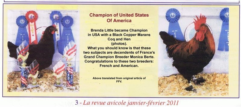 I, as USA Delegate for the Marans Club of France I will remain diligent to breeding my Marans to the French Standards of Marans. One must never lose focus on the egg color of this breed. The egg color must remain regardless of the ribbons handed out by APA.