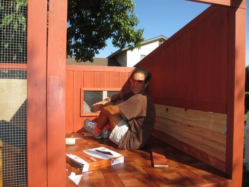 This is the view of the inside of the house. Nesting boxes will go where the unfinished boards are. Me installing the "fake" redwood flooring in a redwood coop - oh the irony!