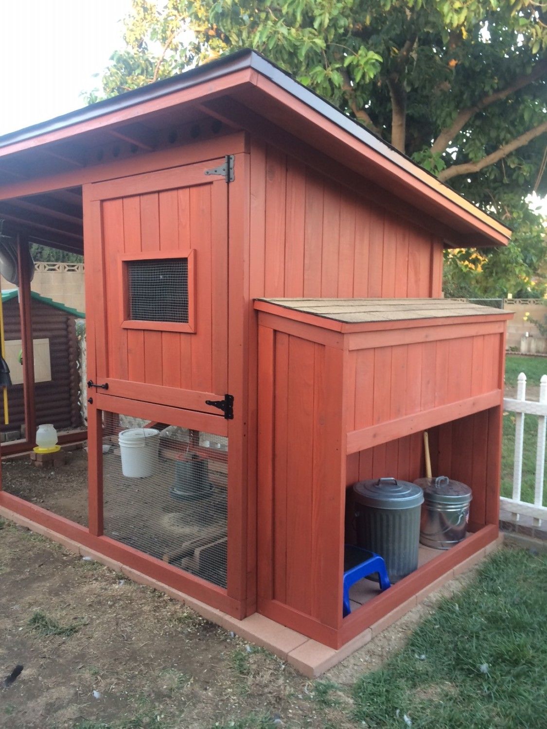 A design idea I had - put a storage area under the boxes! This was before we installed the doors. We keep our feed and scratch in the small metal trash cans. I learned the hard way not to use plastic as we found out our very suburban neighborhood has rats & squirrels who will stop at nothing to get to the feed! As you can see it is complete walled off from the run area under the house. No way for critters to get in, but if they do they will find metal cans.
