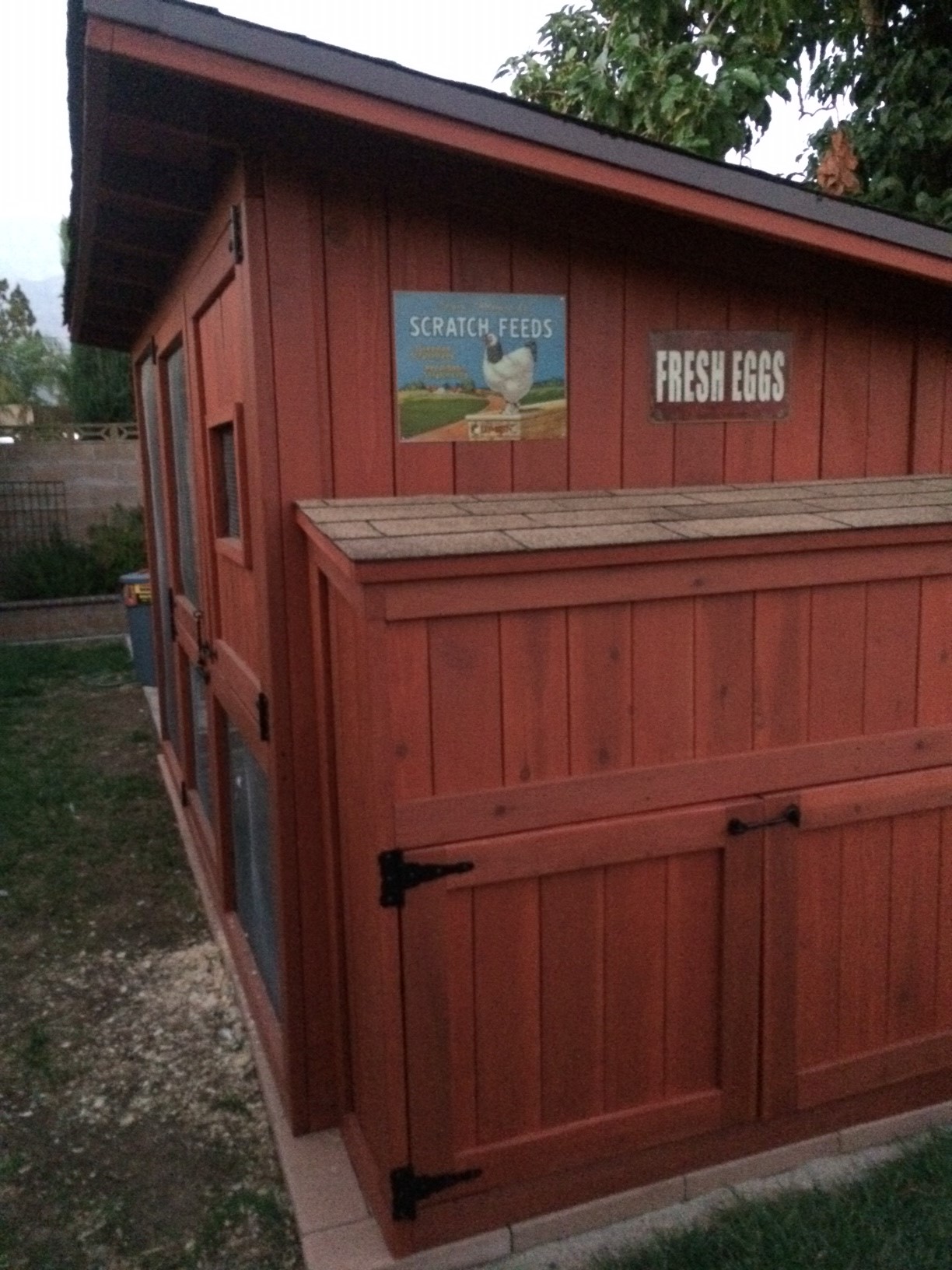 We spent a month constructing the coop after the "Master Builder" had the design down. We had a coupon for 10% off from Home Depot and a list of all the stuff we needed. It was go time!! We constructed it out of redwood - yeah, that may have been overkill, but we only wanted to do this ONCE!! We also constructed the frame to where we could take it apart if needed - in the event we moved or decided chickens weren't for us we could sell the coop. So, the roof is one (very heavy) piece and the panels are solid construction. 2X4s were notched so the plank boards could sit inside flush. Just loosen some screws and it all comes apart. Just a weird design we had to have - leave it us to make it harder.