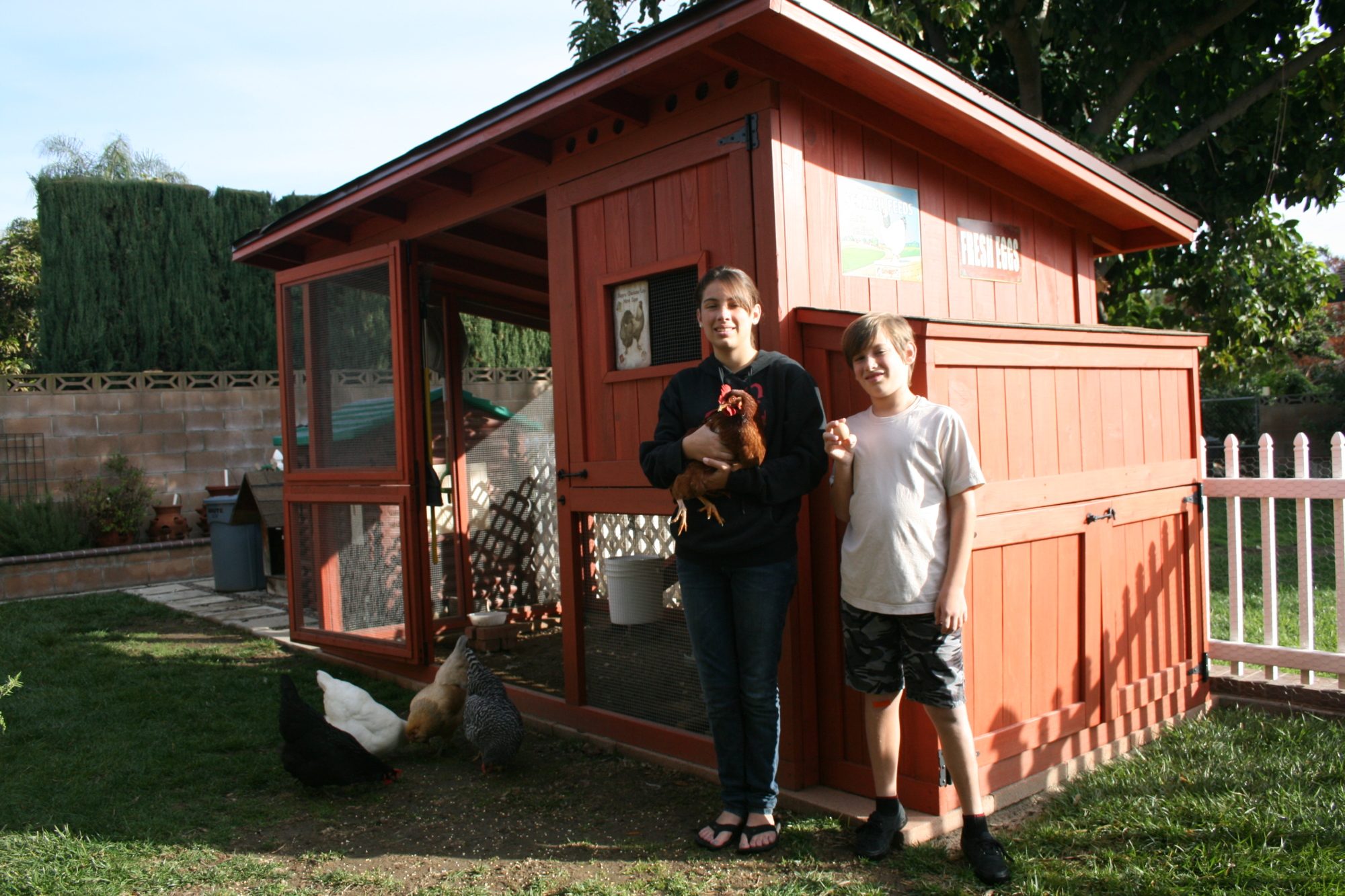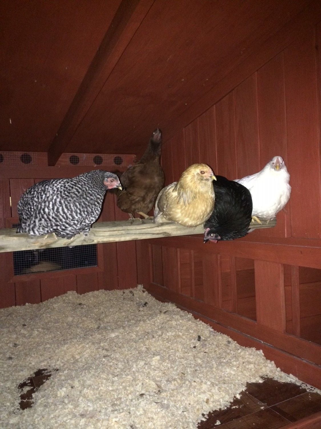 The ladies like their new home!! The kids each picked out a bird so we have quite a diverse flock. And they all have names the kids picked out.