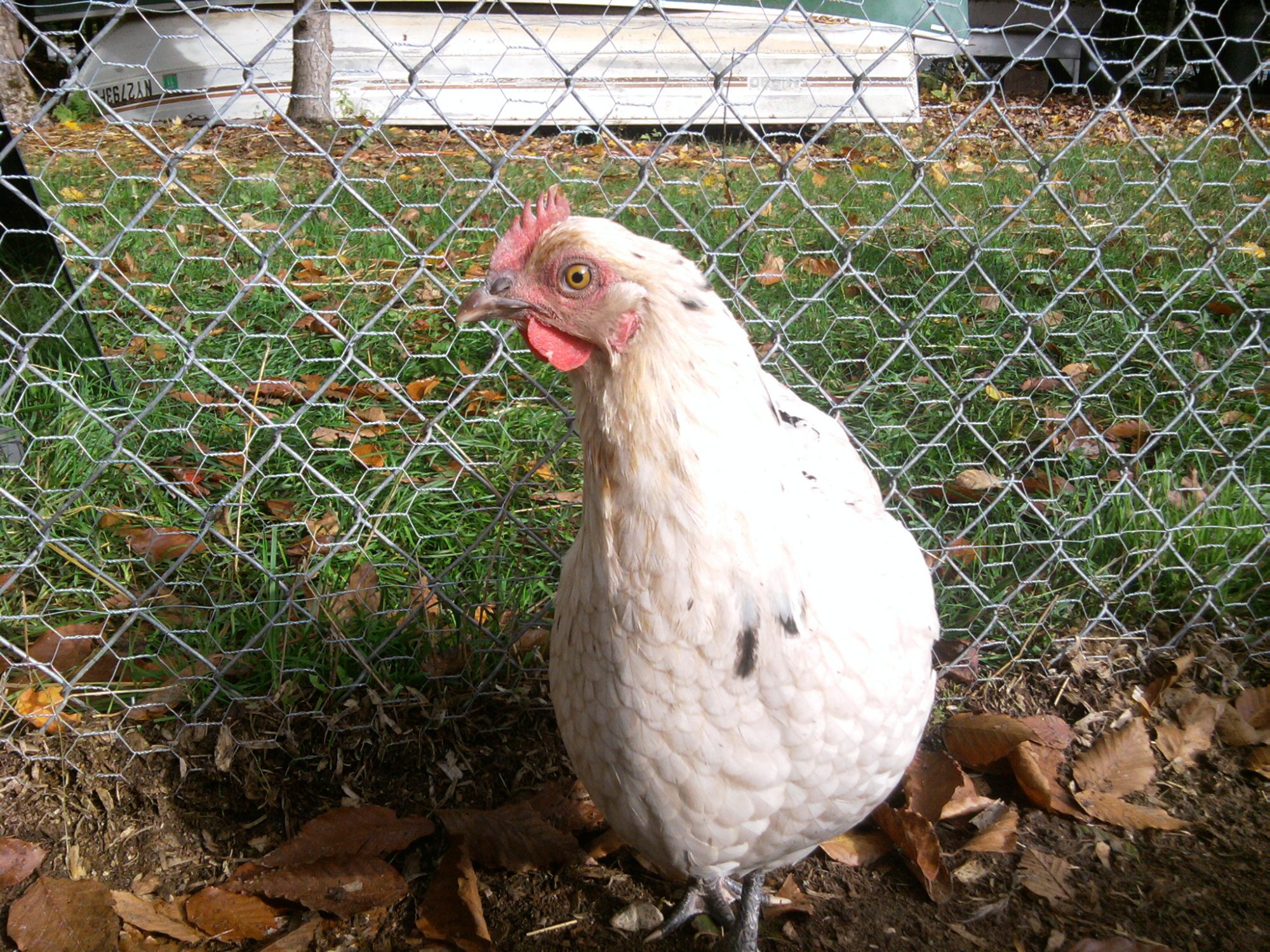 This is Whitey. She's my special needs hen. She's socially inept, a nervous nilly HATES to be handled, but is a faithful layer of a large dark spotted egg almost every day. She makes me laugh. When they free range, she will take flight (impressive heights too) and land nearby, but turned around. She ends up losing sight of the flock and wandering all over in search of the flock, when all she had to do was turn around and look behind her. That's when Yolanda usually comes to get her.