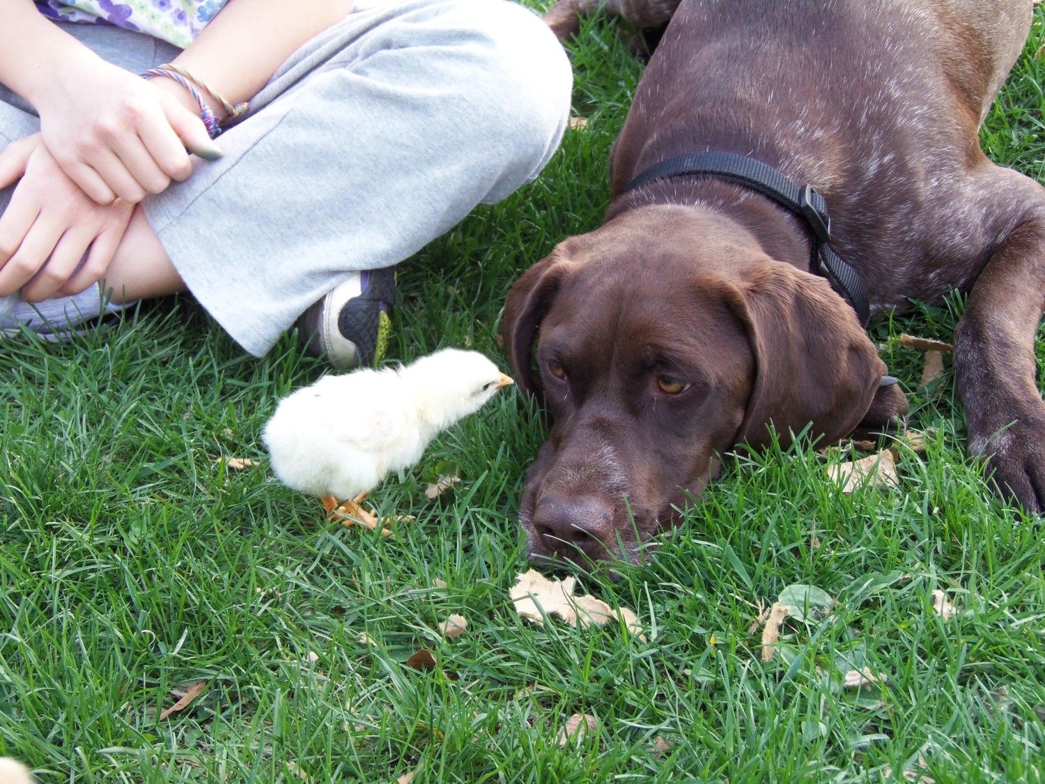 This is Lemon Meringue, checking out my dog's eye goober. Nixie is a German Short-haired Pointer; a bird hunting dog. Luckily, she understands that the chicks, and chickens are not birds. They are part of our pack here.