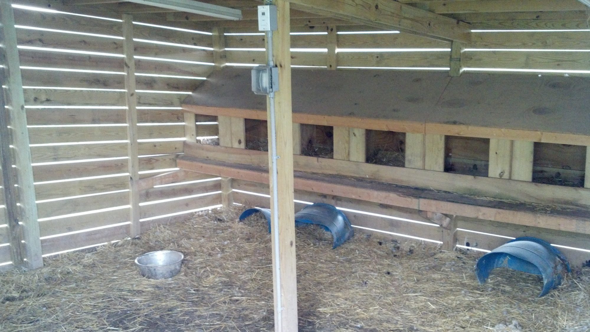The lights in the coop allow for egg production to start early spring. The natural slats in the plank allow for good ventilation without the wind. I use straw as the bedding and just pile it on as it decomposes, I scrape it out once a year to use as mulch or soil amendments.