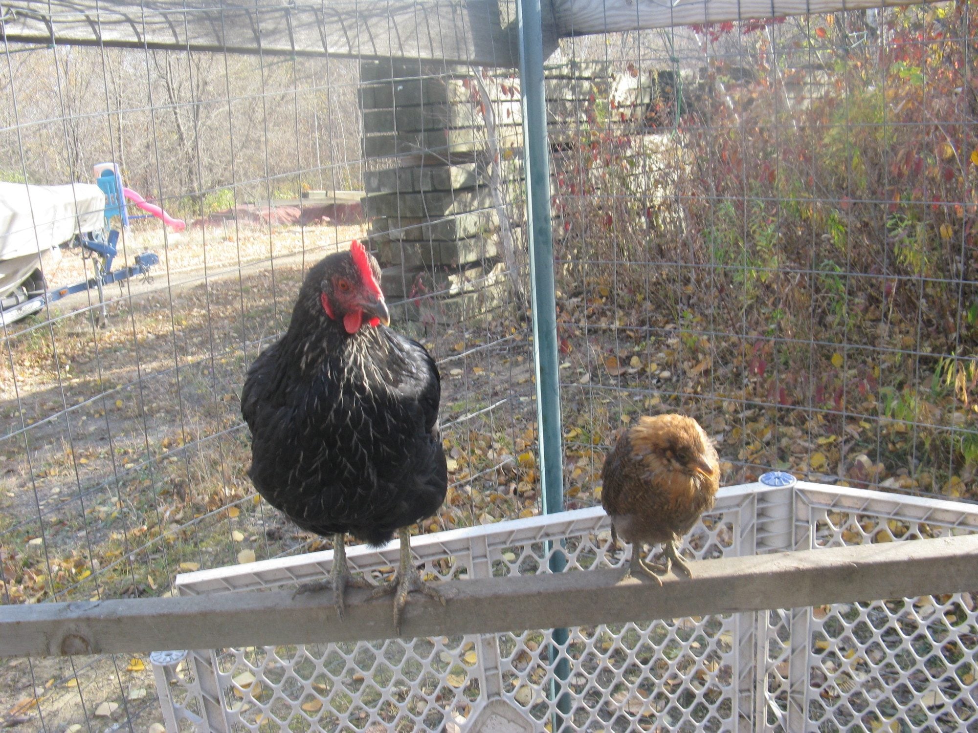 I received an Easter Egger egg from a neighbor for her to incubate. It ended up being fertilized, and she hatched an Easter Egger chick from it, whom I named Penny. Here are a few pics of them together, one when she was a few days old, the other about 5 weeks.