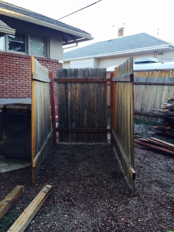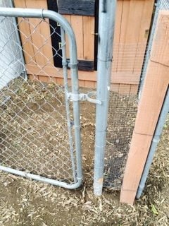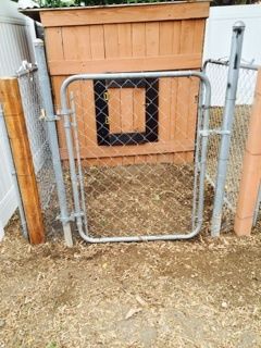 We added the gate next. We also put chicken wire in between the pole and the wood so the chickens couldn't escape.