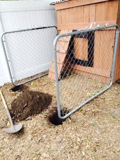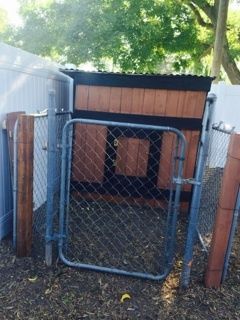 Next was the run. We reused a gate from our old fencing also and attached the two ends to either side of the coop. We dug two holes at the front of each fence and put poles in it. After, we sealed up the hole. We also attached beams of wood to close it up.