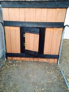 We also cut a door for the hole in the front of the coop. We added a frame and put hinges on it. We attached the door and put a simple lock.