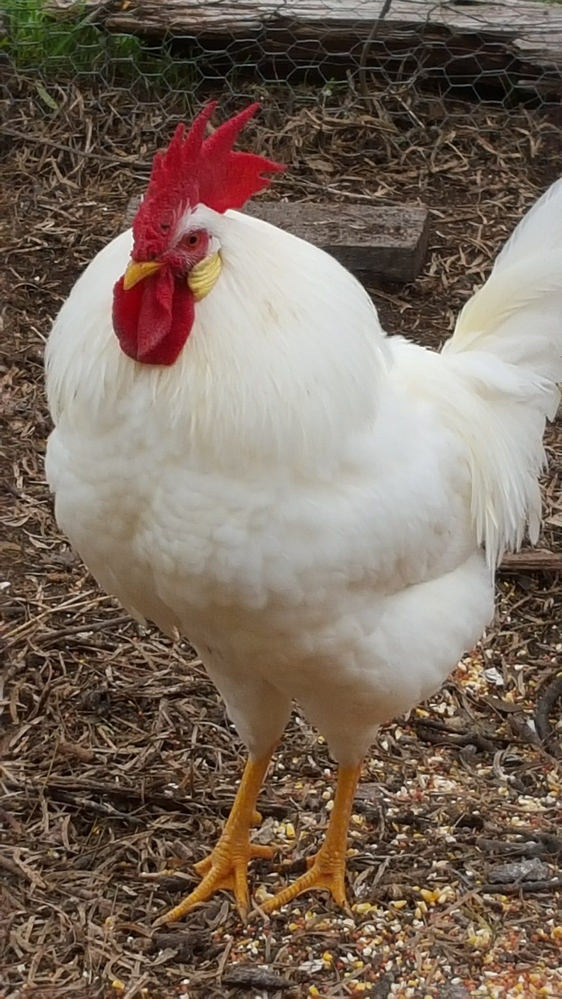 This is Scout. he was the first to be born at the farm since 1989. he was 1 of 4 chicks from my pets. he is the sole survivor of a dog attack. he looks like his daddy who was a stray in my flock. his daddy was killed by a dog attack shortly after scout was born . he was born in June of 2015.