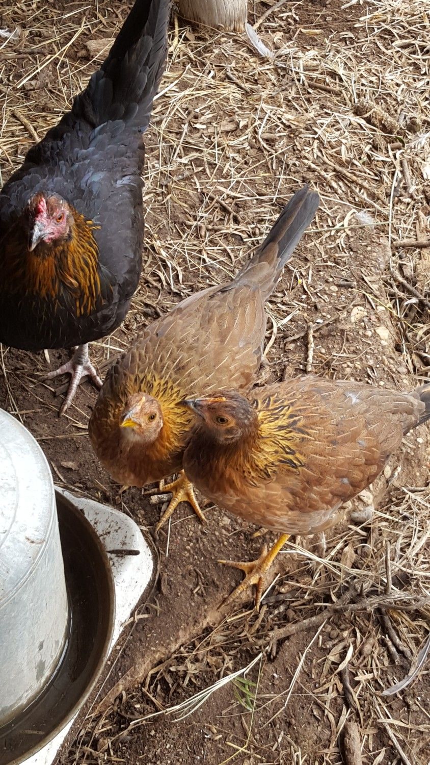 these 2 also born september 30, 2015 have the coloring of their mother in the neck and head but the rest of them look more like their father. they 2 are friendly enough to come up to you. i hope they are not roosters but because of the way their tails look im afraid they are that would make 4 roosters in my flock. so far Scout hasnt messed with them but he is just 4 months older than they are.