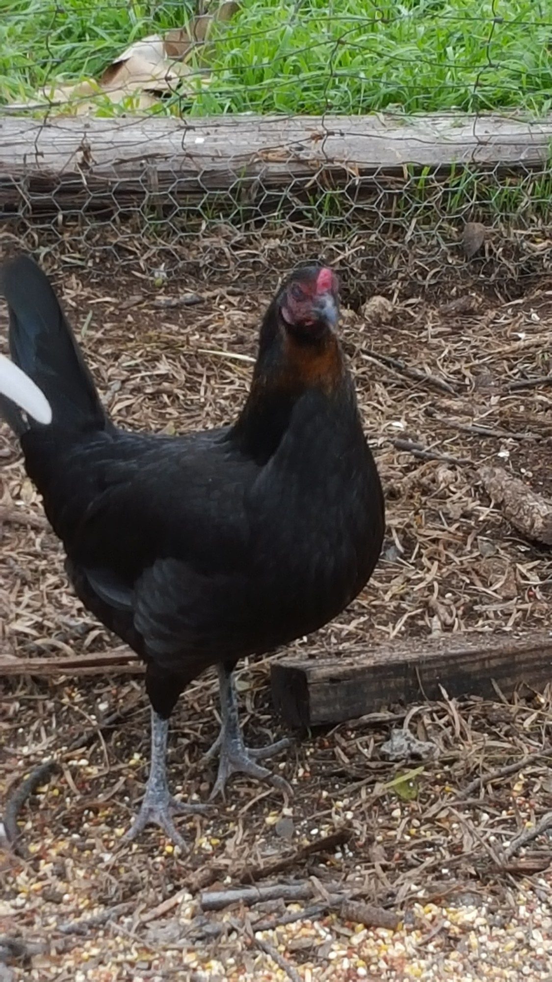 Tamborina and her 2 sisters Road runner and Coconut showed up stray at my house in town. being young and malnourished they joined my original flock of 5 in my back yard. she is 3 yrs old and has mothered Scout but could not raise him. her sister Road Runner had too. Tamborina is very broody and would give up her chicks to steal someone elses nest. she hatched 4 more chicks september 30. and i put six more chicks with her but had to watch her closely and sometimes throw her out of the coop for a few hrs to rescue the chicks. surprisingly she was able to finish raising her brood and has become a better mama. she and her surviving sister Road Runner are 3 yrs old. out of the 10 chicks she raised she only lost one to a stray cat all her babies except her original 4 are pictured above. any ideas of her breed? left wing has a single white feather and her neck has a rusty tint. her sister coconut was the same exept her neck was frosty colored. and Road runner is solid black with one white feather on her wing as well.