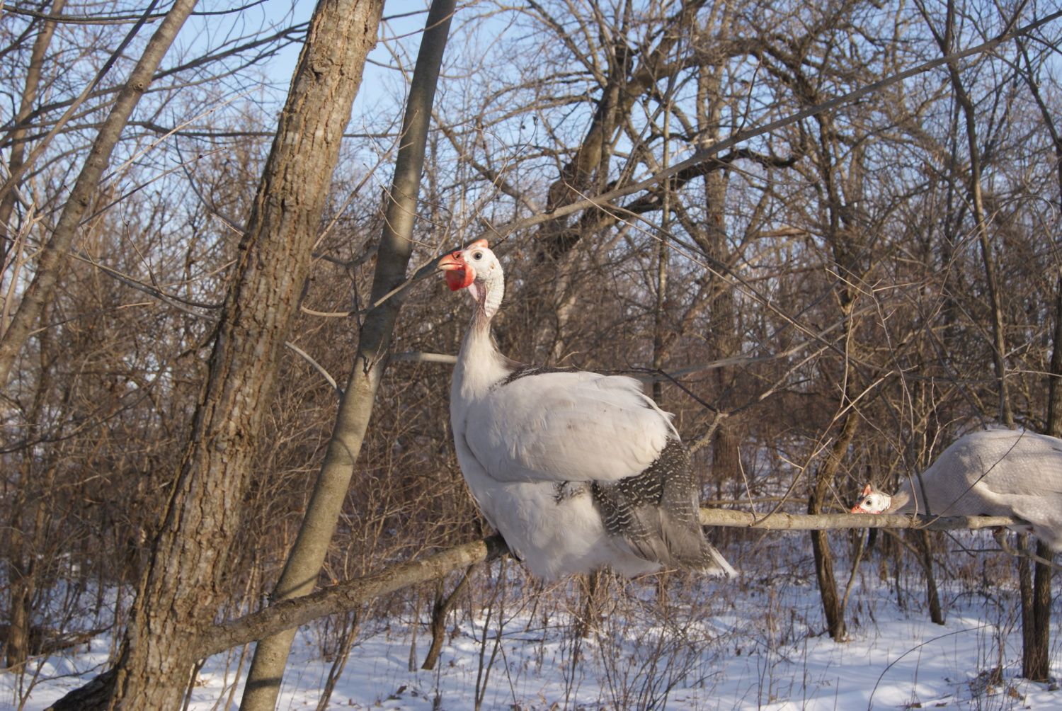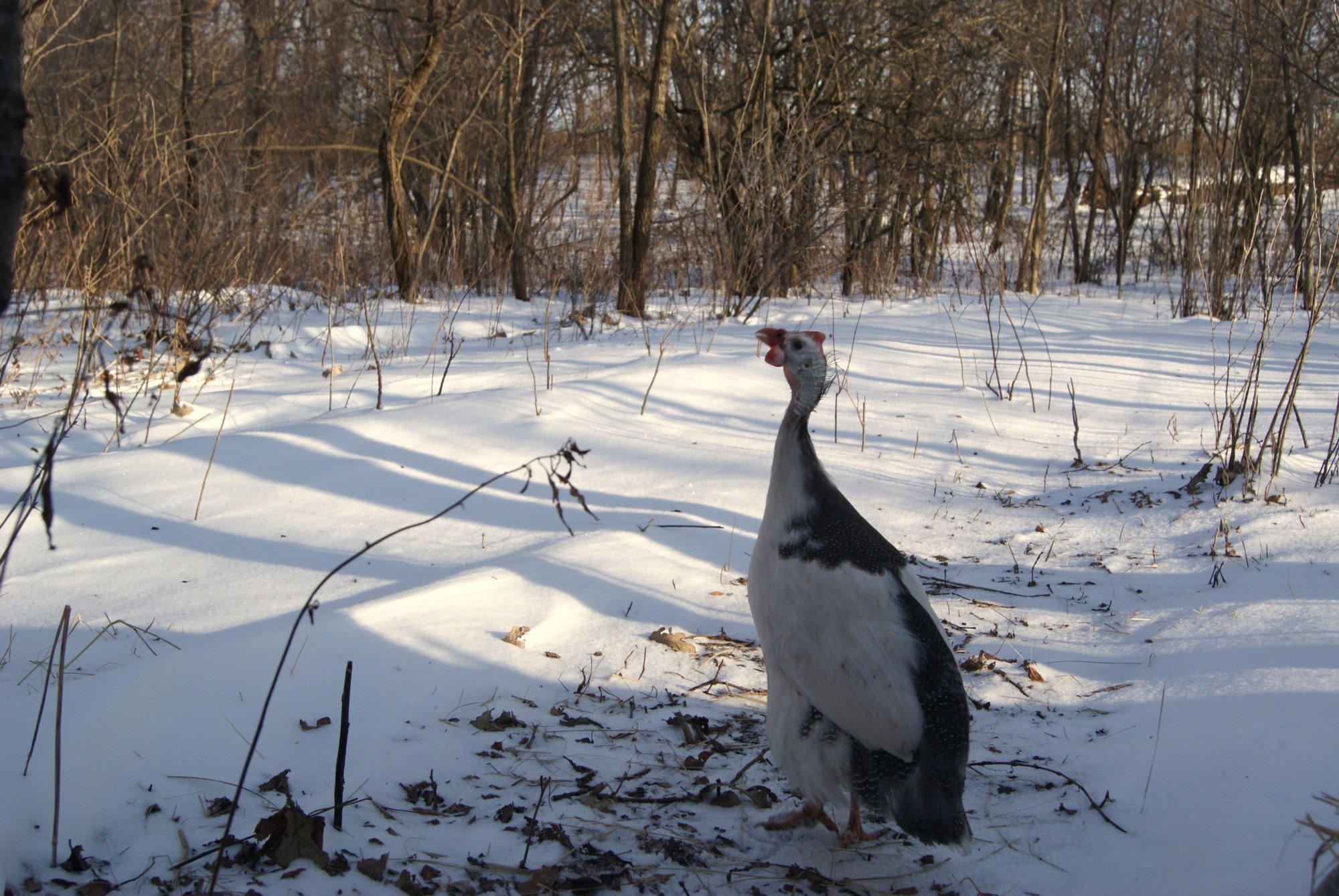 I regret to update that we had our first predator attack and lost one (of two) of our much loved pinto guineas. We let the guineas out two days after our first snowstorm and did not anticipate how afraid of the snow they would be. They flew up into some of the tallest, huge oak and elm trees on our property and only flew higher when we tried to get them down. Nothing we tried to do would lure them back to the ground and after dark set in we were forced to leave them for the night. We were out before sunrise to find one lavendar guinea injured on the ground. It's injuries do not appear to be life treatening and we are treating the wounds. Our pinto guinea was nowhere to be found. We found many coyote tracks in the snow around the trees they were in, and the tracks were followed to the point of attack on the ground. We are very sad for this loss. Fortunately by the afternoon, all other guineas were accounted for and lured back into the secured run with the help of some food and treats. We knew we live in an area that is very dense in a wide variety of predator and have built our run secure enough that we believe will keep them safe whenever we can get them to come back home.