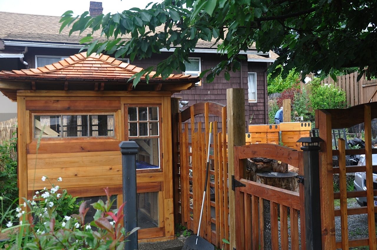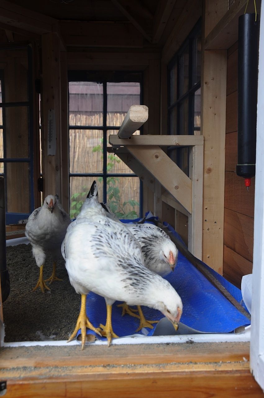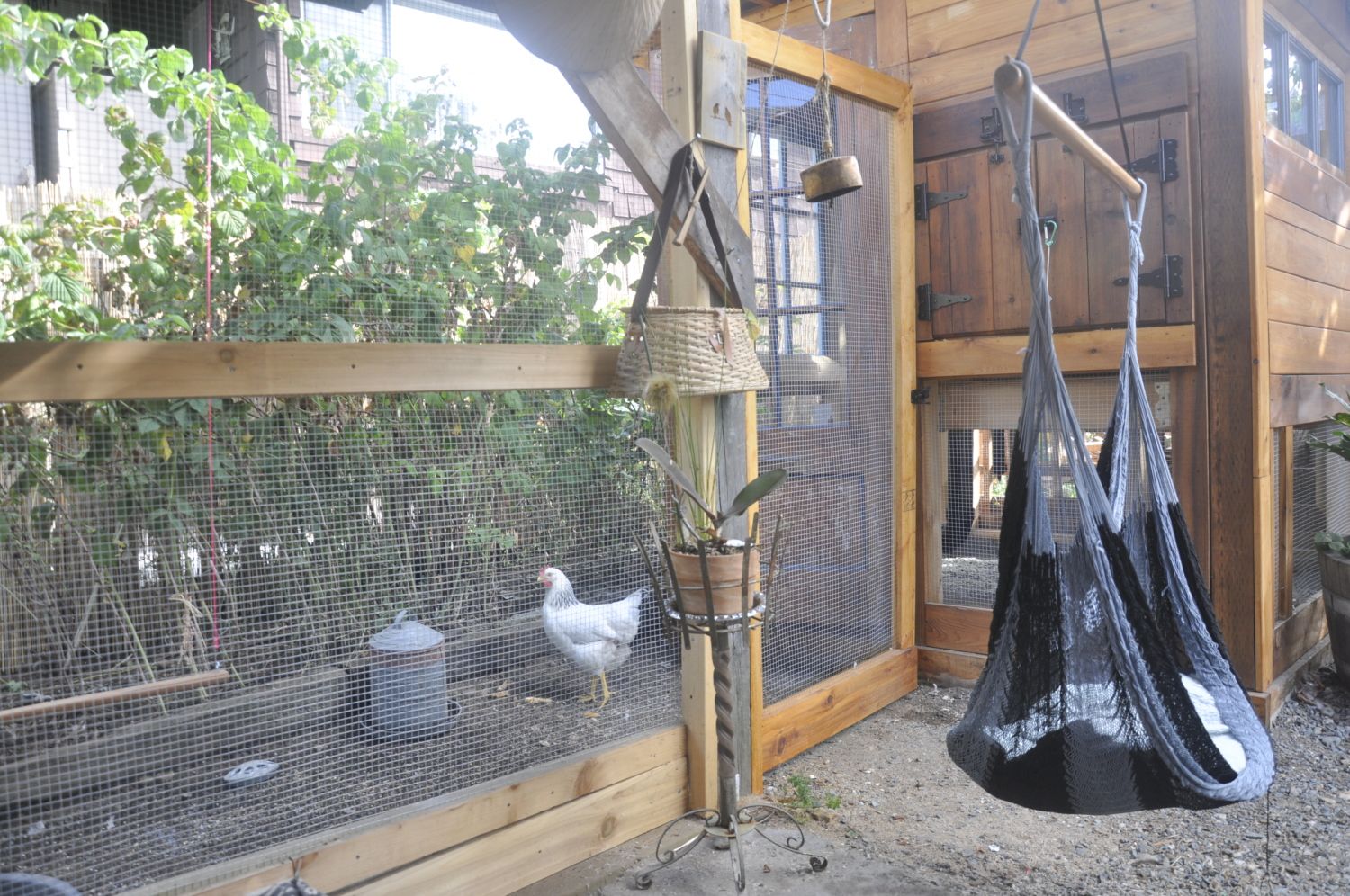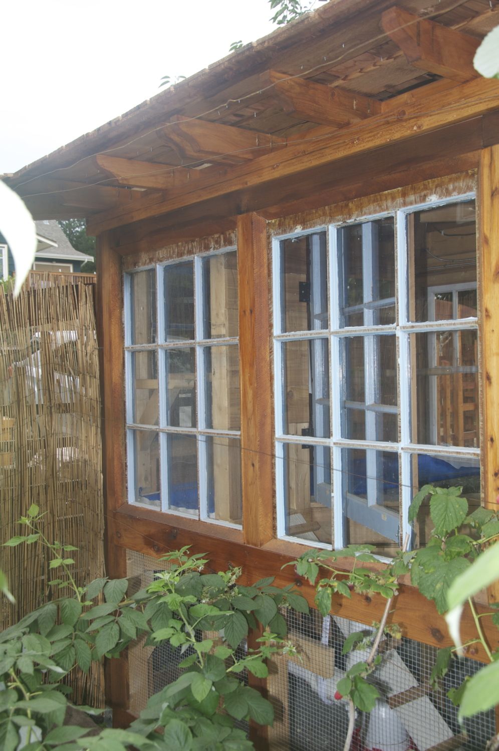 The chicks can roost and check out the raspberry patch through the windows. All the windows were found at Demxx in Coombs, B.C.