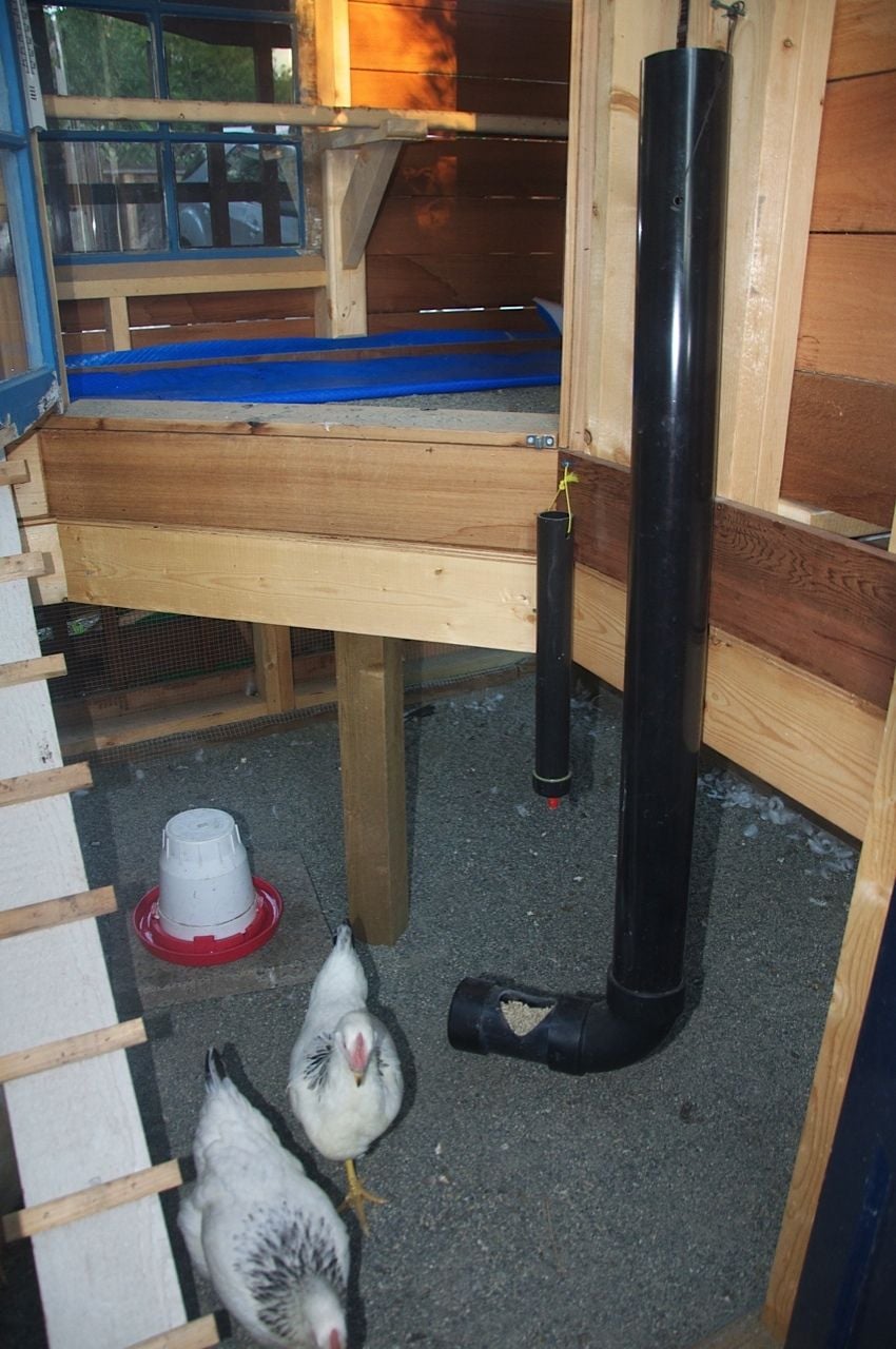 A feeder made with ABS pipe which works well. Now to figure out how to make a chicken swing. We like the video on www.fowlplayproducts.com/the-chicken-swing.html