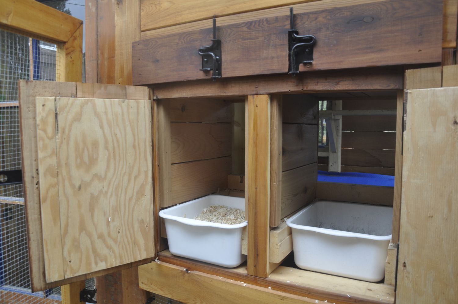 The nesting boxes are on the side of the hen house. A carabiner is used to secure the side bolt latch from predators.