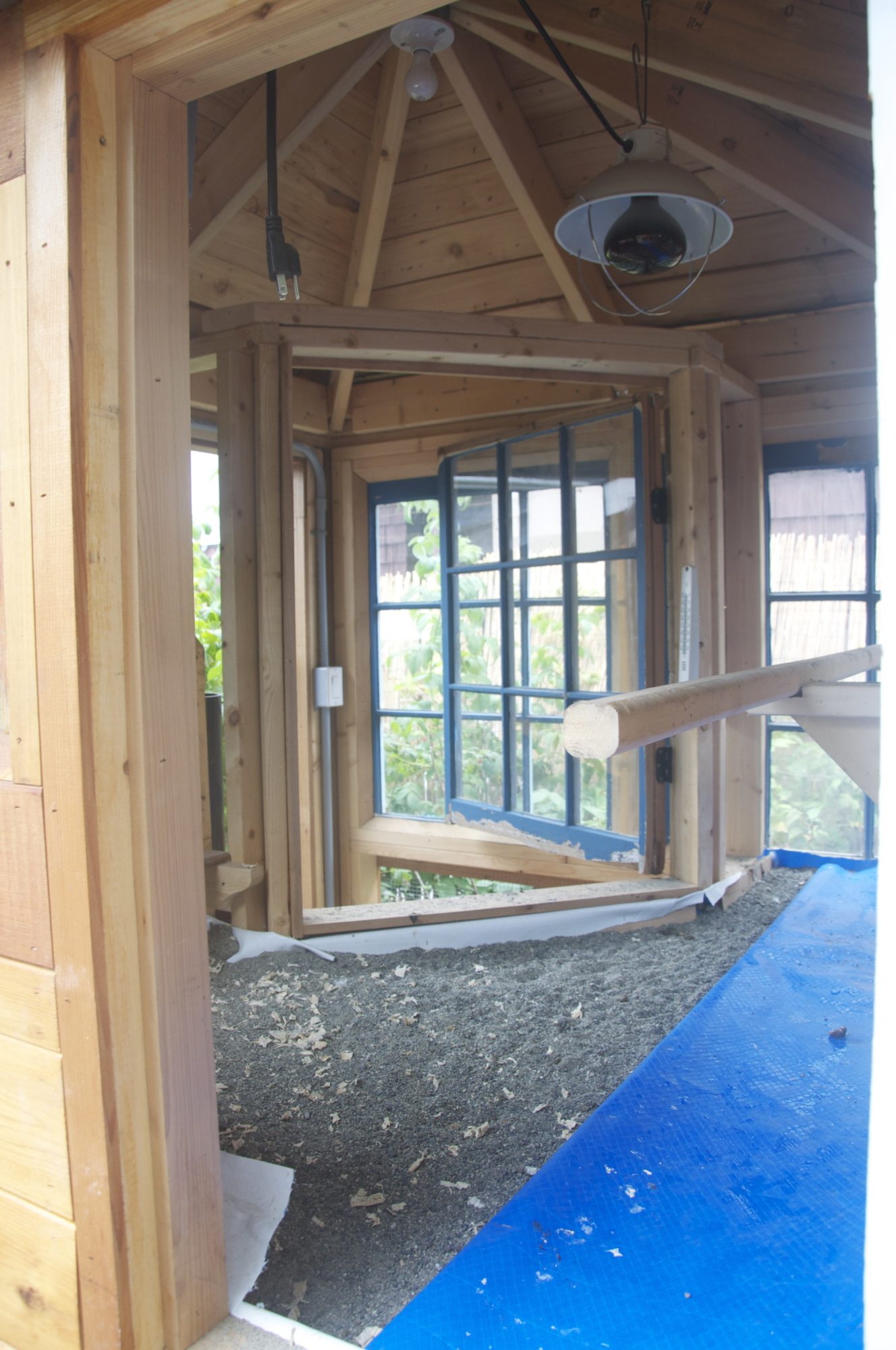 An inside look of the nesting boxes. They have been busy playing with the wood shavings. The coop has power. I am not sure if a flat panel radiant coop heater is needed for the winter months. I know dampness hurts your birds more than cold.
