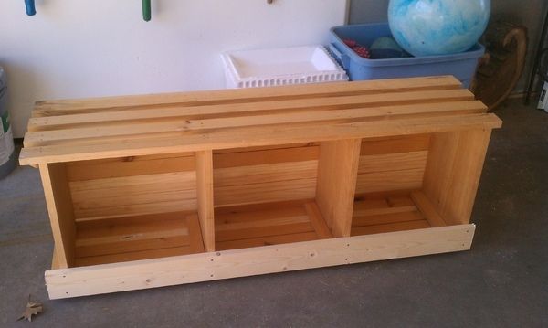 This is the end result of a nesting box. I will be adding a slanted "roof" to it once it's mounted as well to keep them from perching and laying on top of it. I left the slats open on the top to help with ventilation and am considering adding some curtains for the box since it will be in a highly lit greenhouse/coop. Gotta give the girls a bit of privacy.