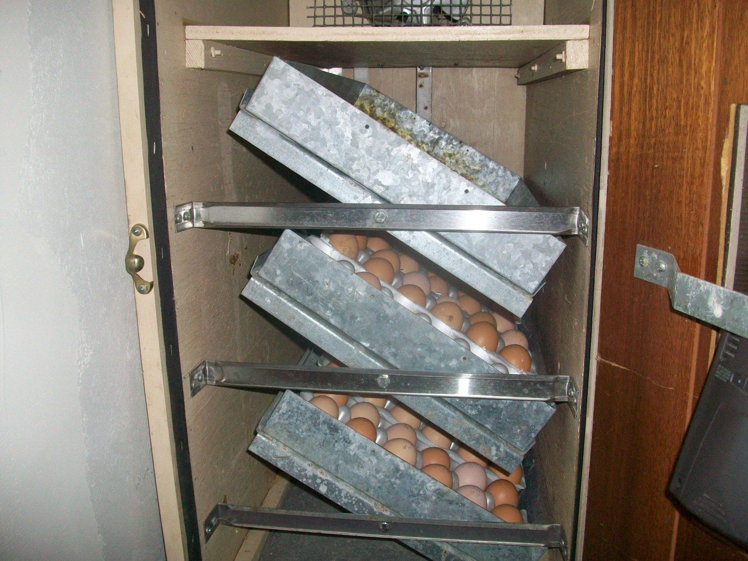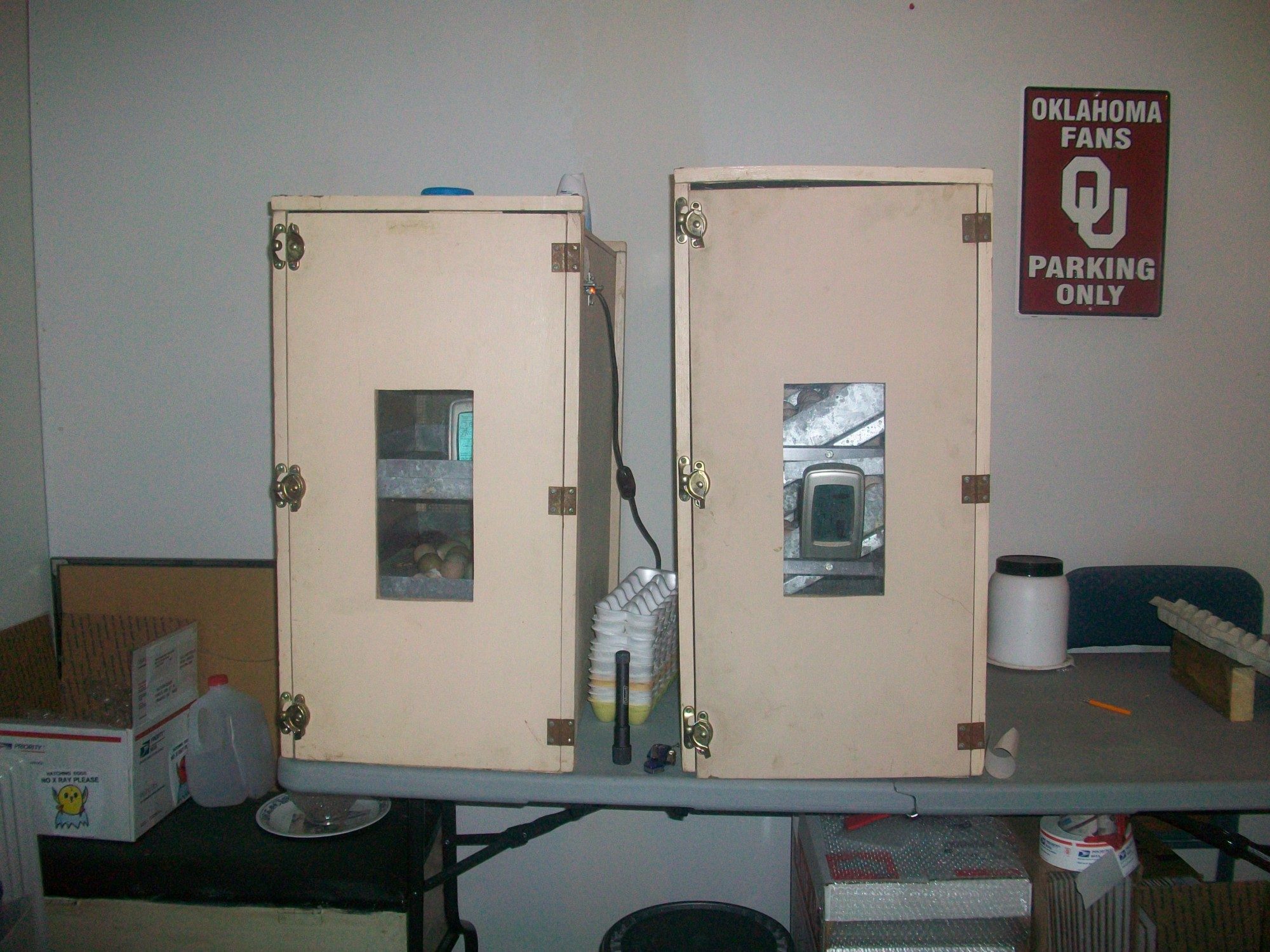 This is my Incubator (Right) and Hatcher (Left). The Incubator holds around 22 dozen eggs and stays pretty much packed full!