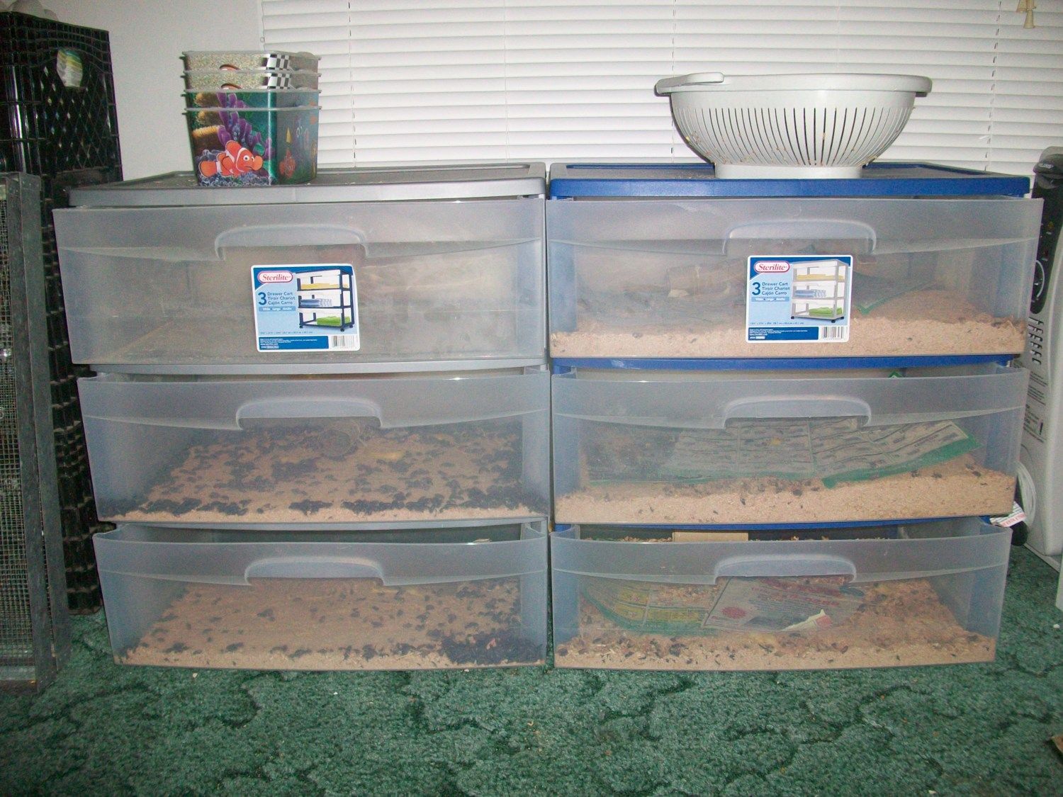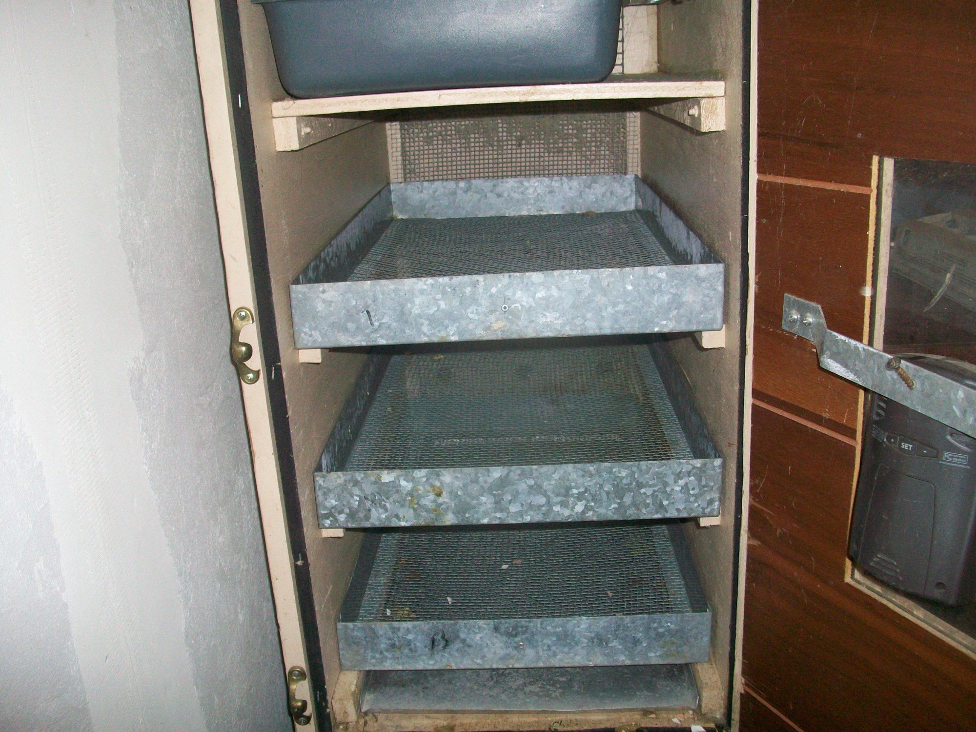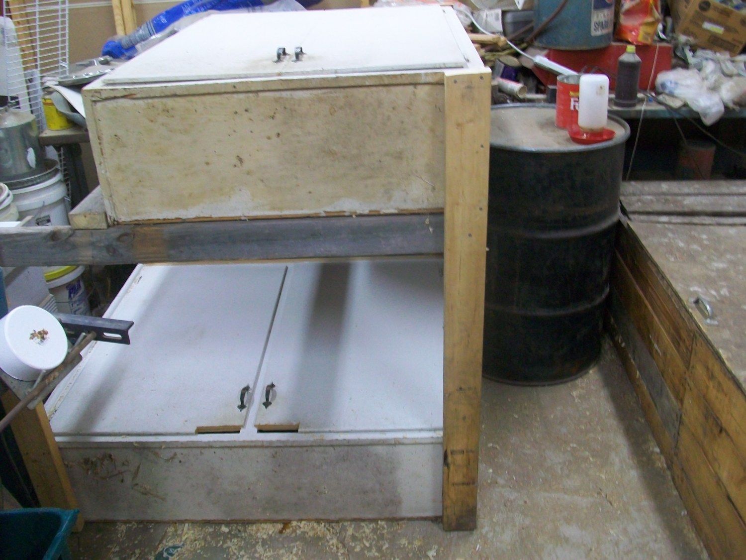 Here is our Reused Double Decker Cabinet Brooders. I was cleaning out my Father In Law's Shop and I asked if I could have them. He said sure. I told him that I will make brooders out of them and he liked that I was reusing materials!