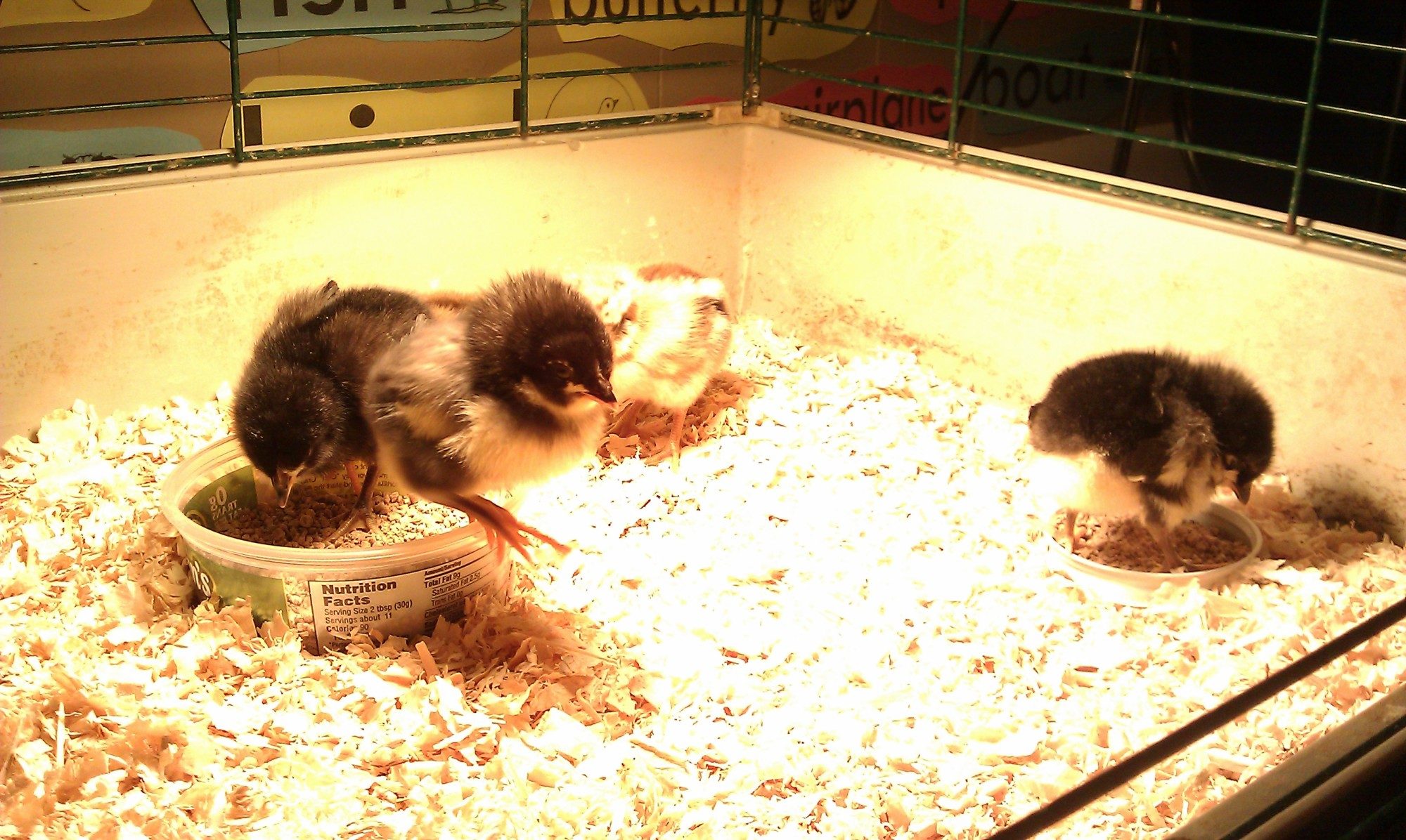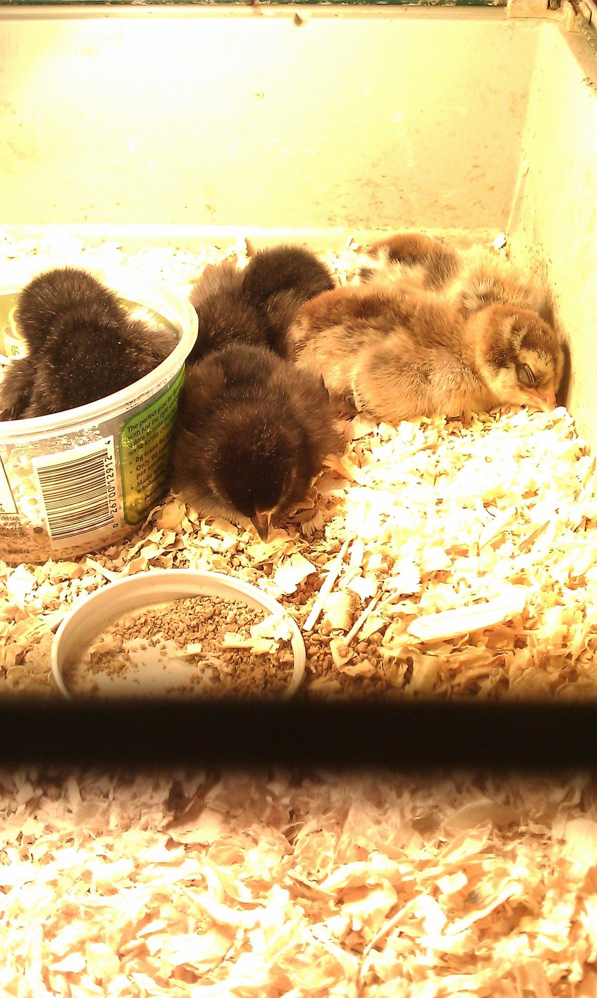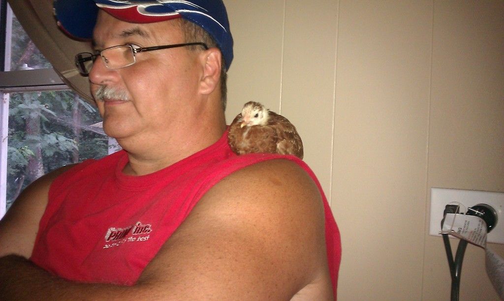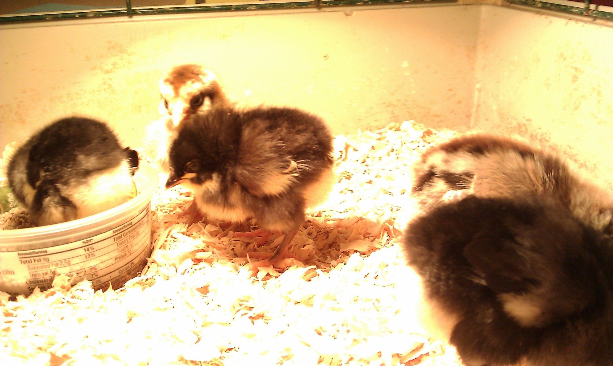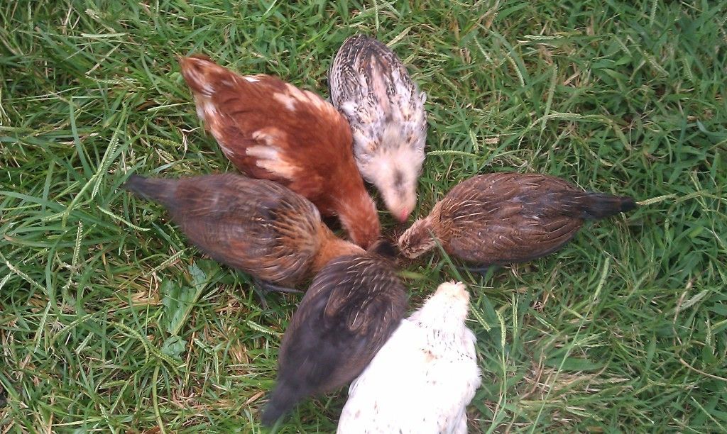 Our first set of babies, which all turned out to be roosters! After realizing we had 9 roo's, we picked one to keep and traded the rest for new babies... 35, plus we bought to older hens. Our hens and babies are just backyard mutts, but we love all the differences in them.