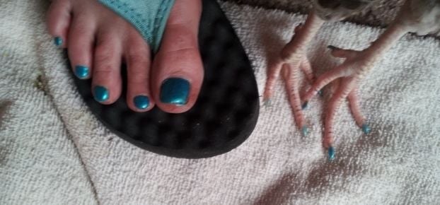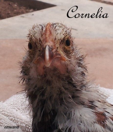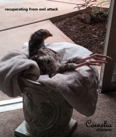 ( After about a 1/2 hour search found the 8th chick alive but limp laying in the tall grass and that little ******* owlet in a nearby tree. I took her inside and checked her over...found 2 bloody puncture marks on her back and some feathers missing here and there...CURSE THAT OWL...she couldn't stand up & was obviously in shock (who wouldn't be!) I cleaned the wounds & put triple anti-biotic ointment on (yes the kind w/o painreliever), put her in a box in a quiet spot in the house. She drank a little water but wouldn't eat anything. Checked her 1st thing in am and she seemed ok but still wouldn't stand up. I gently felt each leg and didn't feel any obvious broken bones. She would flap her wings and try real hard to stand...but nothing. That night I put one of her sisters in with her to keep her company for the night. Next morning she ate a little fresh corn and drank a little but try as she might could not stand up. Since she didn't appear to be in any pain decided to wait it out. FAST FORWARD...it has now been 2 weeks since the attack...OMG!!! At nine weeks old, 'CORNelia' (cuz all I could get her to eat was corn at 1st) is working me like never before! She still can't bear any weight on her legs so I have to feed her by hand every couple of hours during the day....her 'likes' and 'dislikes' change daily...if I am feeding her something messy she'll take about 3 bites then turns her head away until I hold a napkin (YES A NAPKIN) in front of her whereupon she wipes her beak and then continues eating a few more bites...then napkin again and so on! AND If she doesn't like something she pushes it away with her beak and gives me the back of her head! Being an invalid that has to be hand fed means she goes to work with me....she goes grocery shopping with me...she goes to the pharmacy to pick up my moms prescriptions with me....ALL the old ladies at my auntie's hair salon ADORE her...I made her a diaper....a walker....3 different kinds of 'slings' to carry her in....painted her toenails same color as mine and I HAVE to be in view AT ALL TIMES or she starts dangerously flapping around her cage....I know I'VE CREATED A MONSTER...(it's not me it's my guilt for leaving them alone)!!!! I'm keeping fingers crossed she starts walking again SOON.....I sure do love that little chicken...TO BE CONTINUED.....UPDATE...lost another chick today