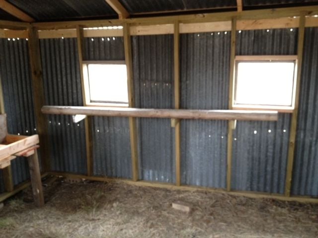 My husband started out by constructing a 12x10 structure. We went this big because we still had the original roof of the old coop in tact and had moved it the 8 mile stretch via a large trailer to our new home. When we got it here we realized we would have to take it apart and put all new wood on it if we did use it, so my husband just constructed as usual and pieced together the roof using pieces of tin from the old dairy.