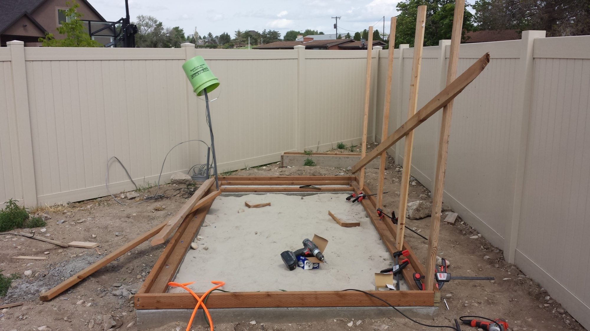 Most of the initial wall frame studs are up, at this point I installed the hardware cloth that will later be sandwiched between another layer of 2" x 4"'s. You can also see the coop base (4' x 6') slanted slightly for easier cleaning.