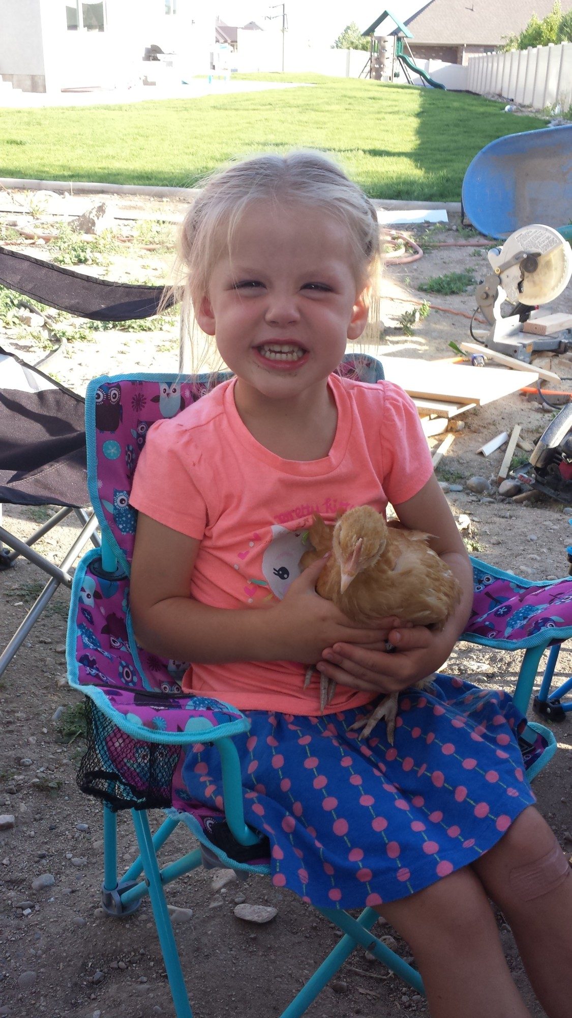 My daughter with Sunny, our Orphington. She reflects how happy I was to finally be able to move 8 week old chickens out of the basement and into the coop.