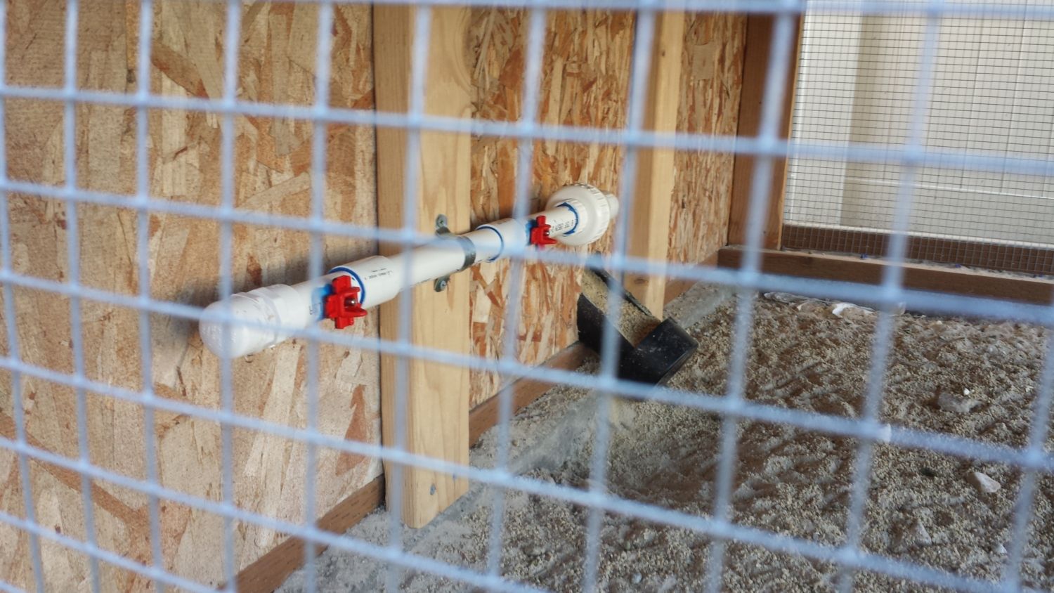 This is where I really spent some time. The feeder works great, yes that is feed on the ground. When I initially poured the feed in it shot out at the bottom, works perfect now, just need to add feed before it gets empty or pour some in the bottom first before filling from the top. It took a lot of work to get the nipples to not leak. I used chicken techies waterer plan which allows for weeks of water at a time and water that won't freeze in the cold Utah winters. Check it out here: